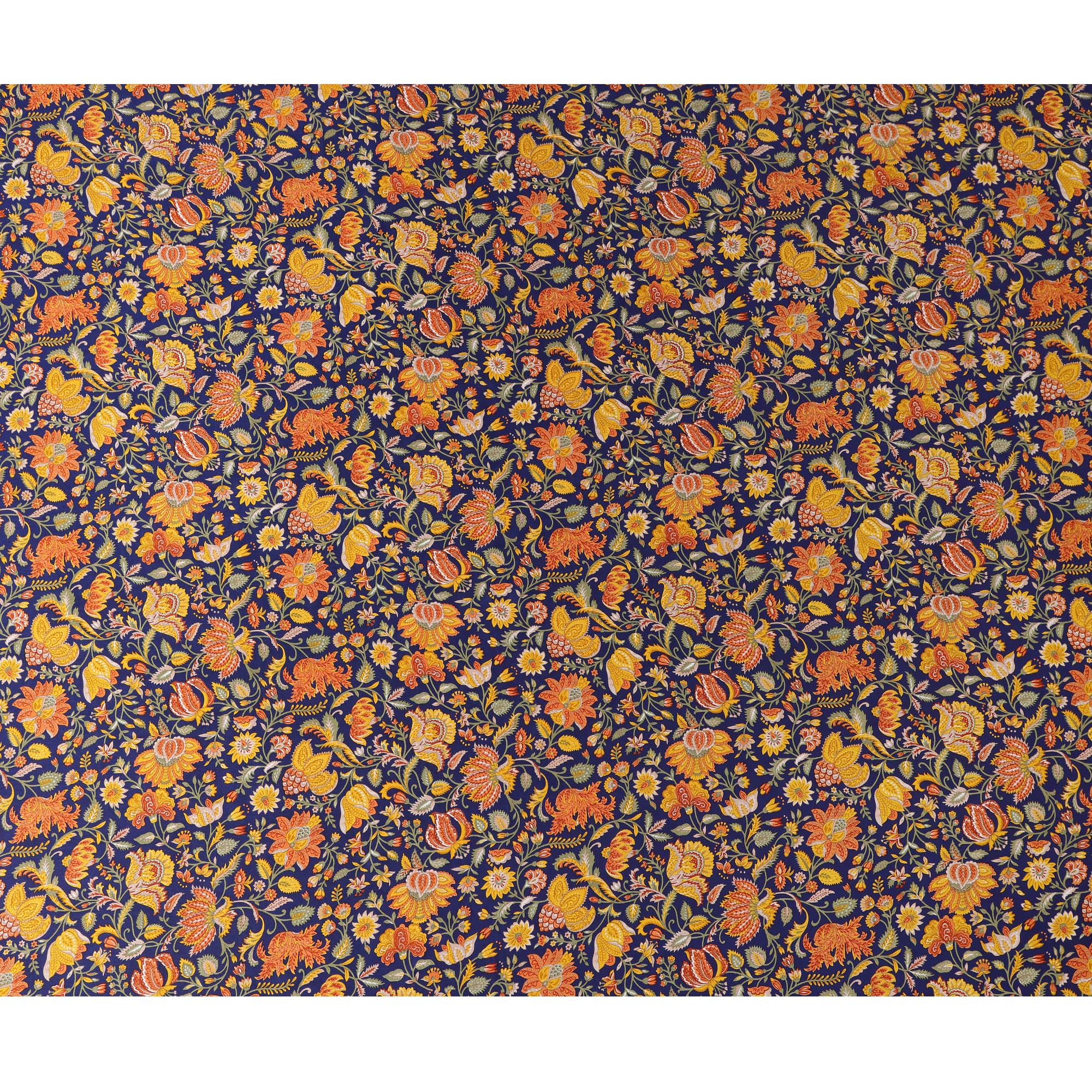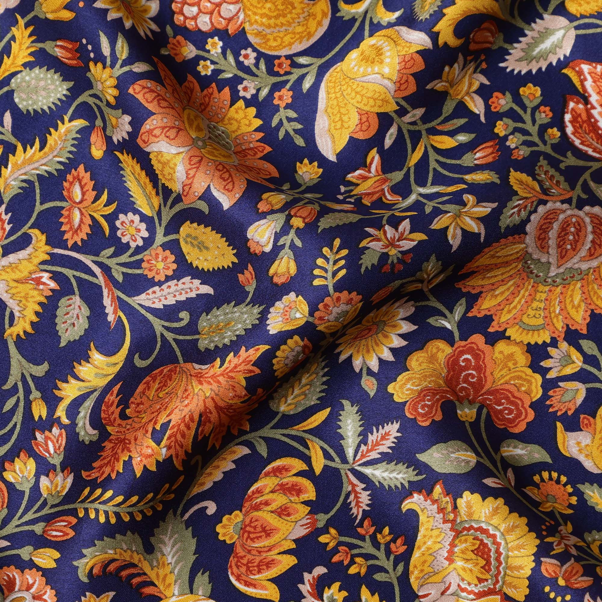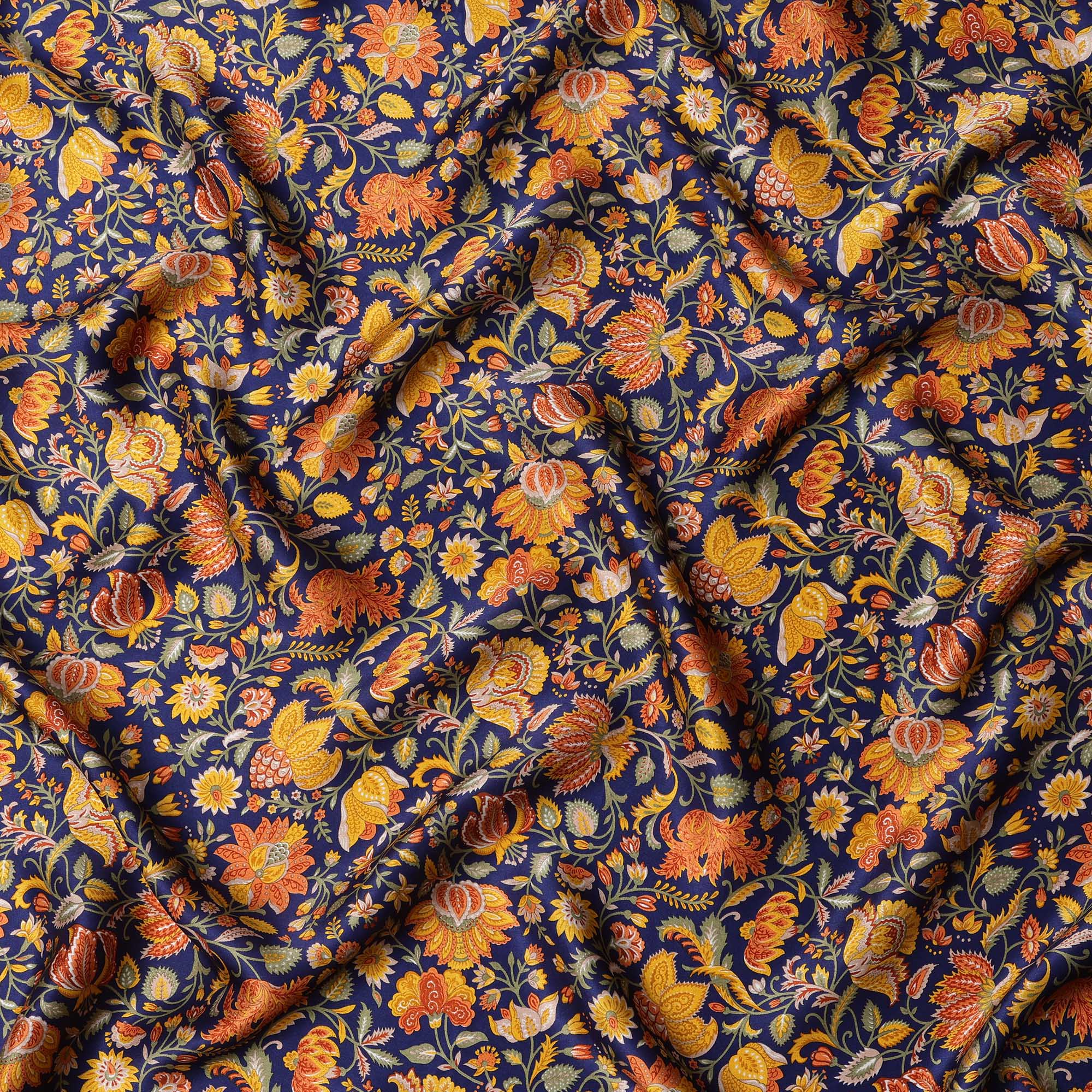 This navy blue silk satin fabric is adorned with a vibrant floral print inspired by traditional Mughal garden artistry, featuring detailed blooms in rich tones of mustard yellow, burnt orange, and golden ochre. The intricate floral arrangements flow gracefully across the fabric, creating a tapestry-like effect that is both regal and artistic. With its lustrous satin finish and smooth texture, this fabric delivers an elegant drape and luxurious feel ideal for sarees, festive tunics, jackets, and fusion ensembles. The generous 110 cms width allows for diverse styling possibilities, while the high-quality silk satin enhances comfort and fluidity. Made in India, this fabric celebrates timeless motifs through a bold and modern color story. Perfect for ethnic couture or contemporary festive wear, it promises sophistication and charm in every fold. Shop online now to embrace rich Indian textile heritage.