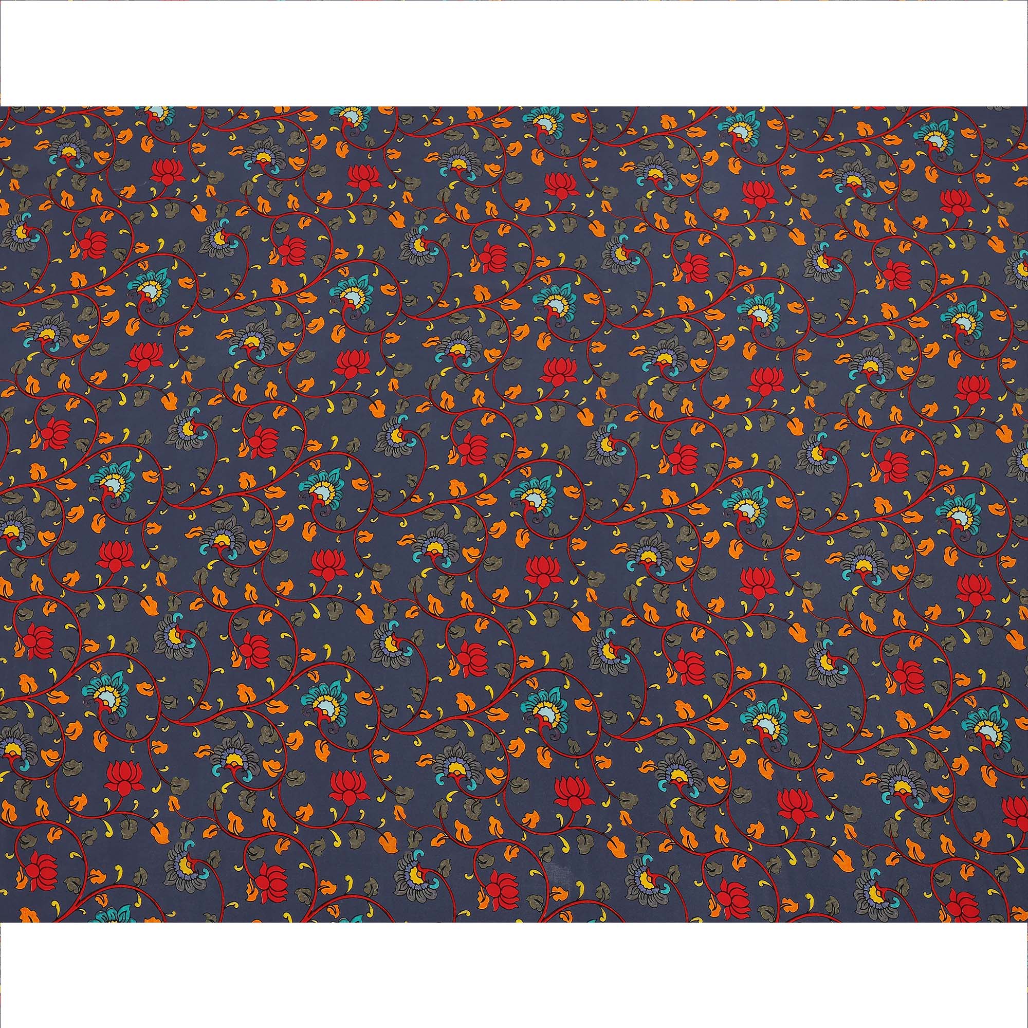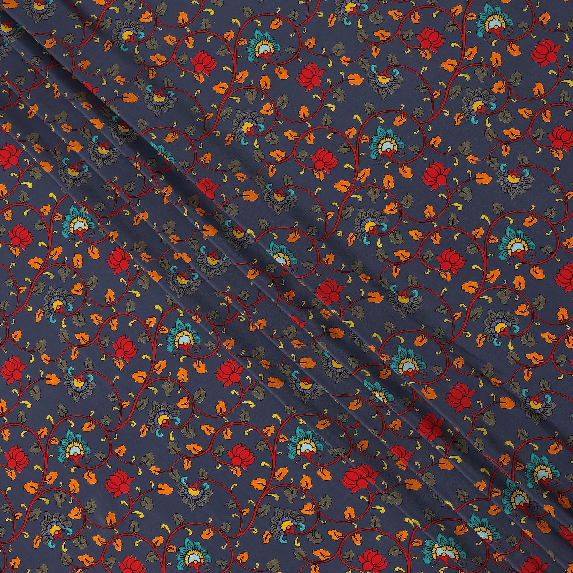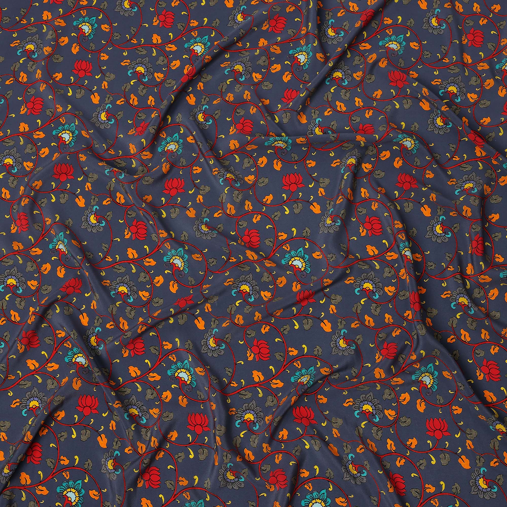 Premium navy blue pure silk crepe fabric with multicolor lotus floral print.