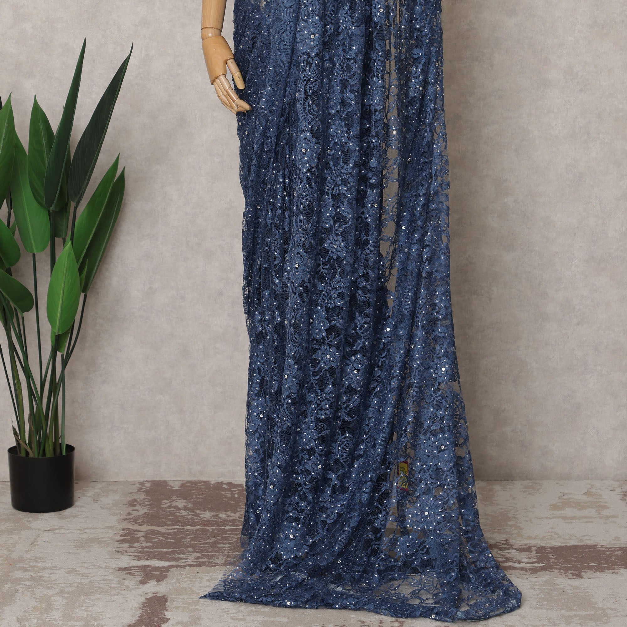 Navy Blue Premium French 2-Tone Chantilly Lace Saree Fabric with Stone Work – 5.5 Meters Length & 110 Cms Width – Imported from France-D22947