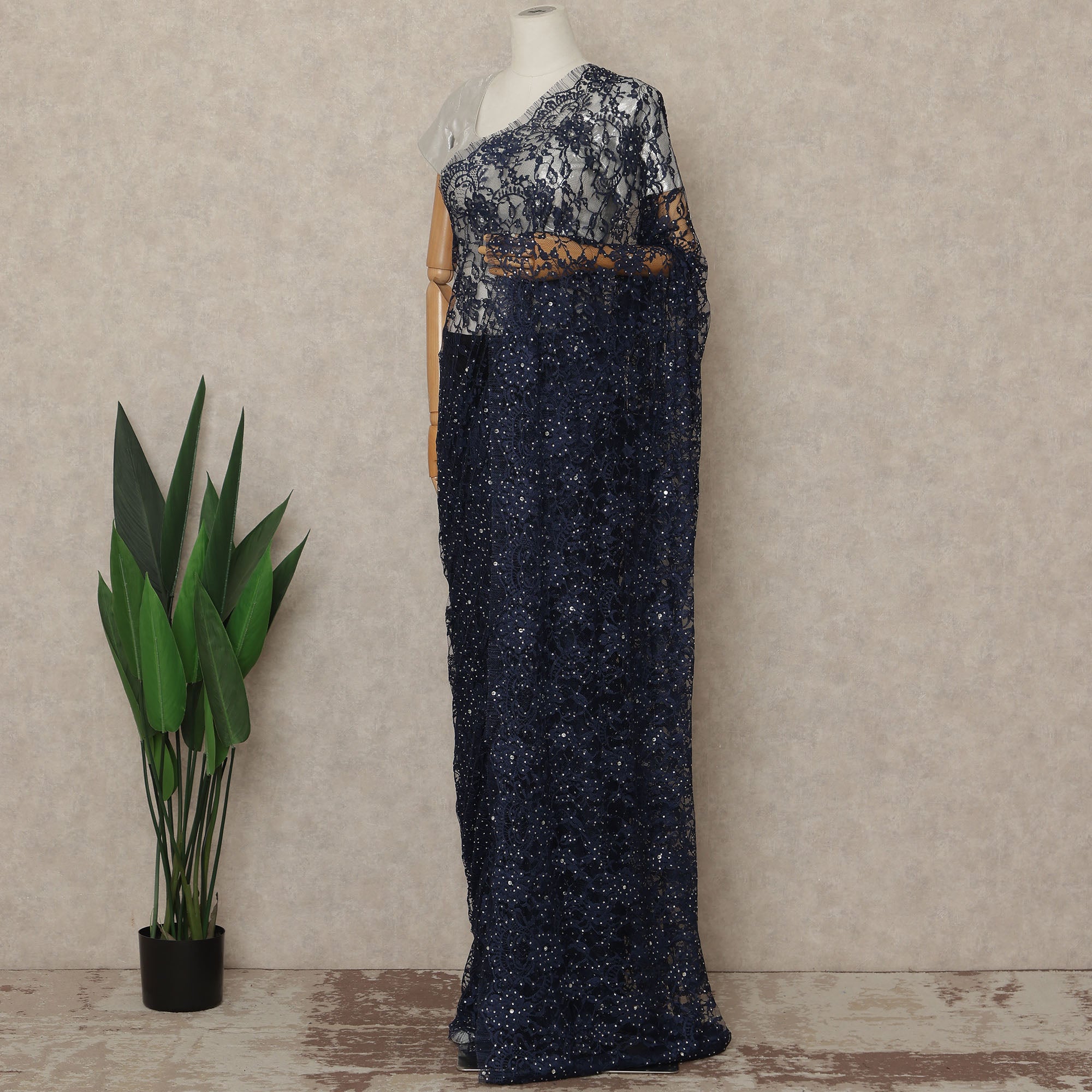Navy Blue Premium French Chantilly Saree Lace With Stone Work 110 Cms Width 5.5 Meters Piece Elegant Floral Net Lace From France For Designer Sarees And Couture Draping-D27691