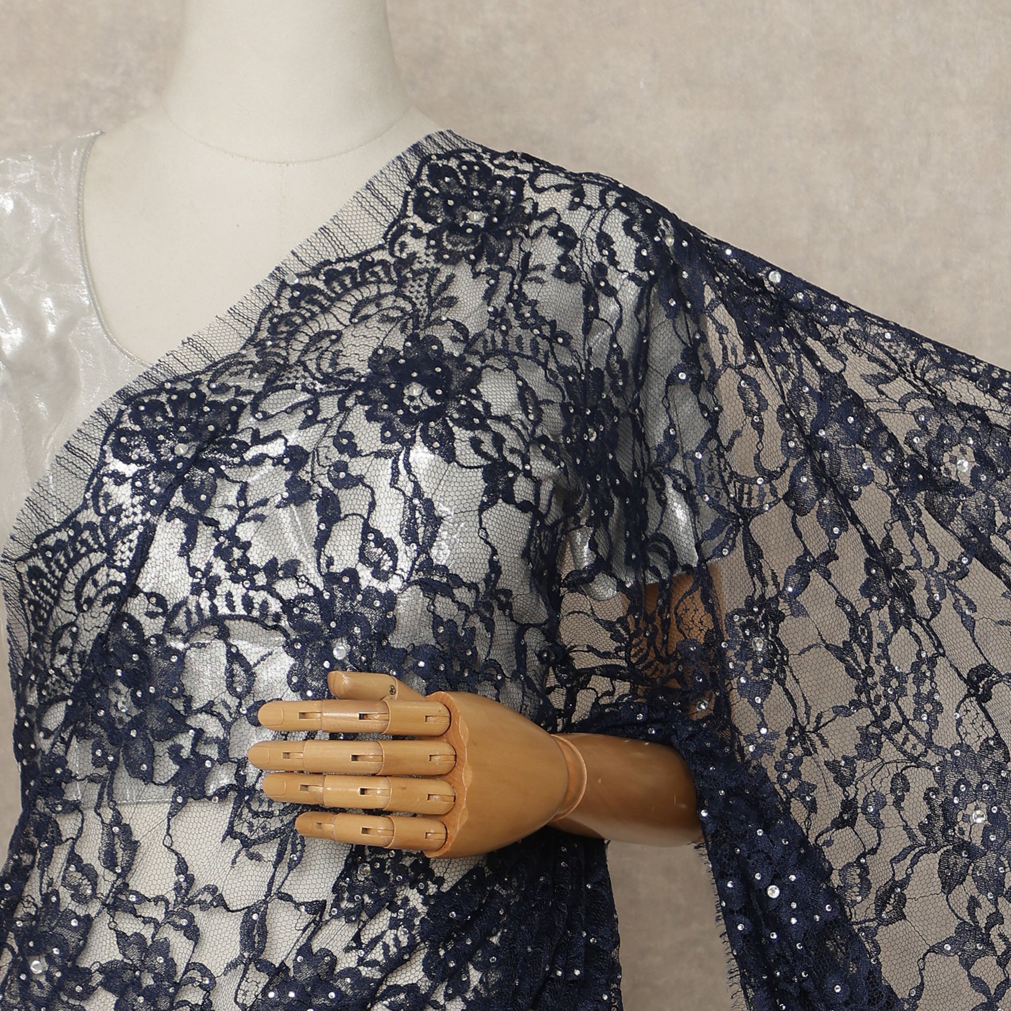 Premium French Chantilly lace in a deep navy blue shade for a classic and elegant look