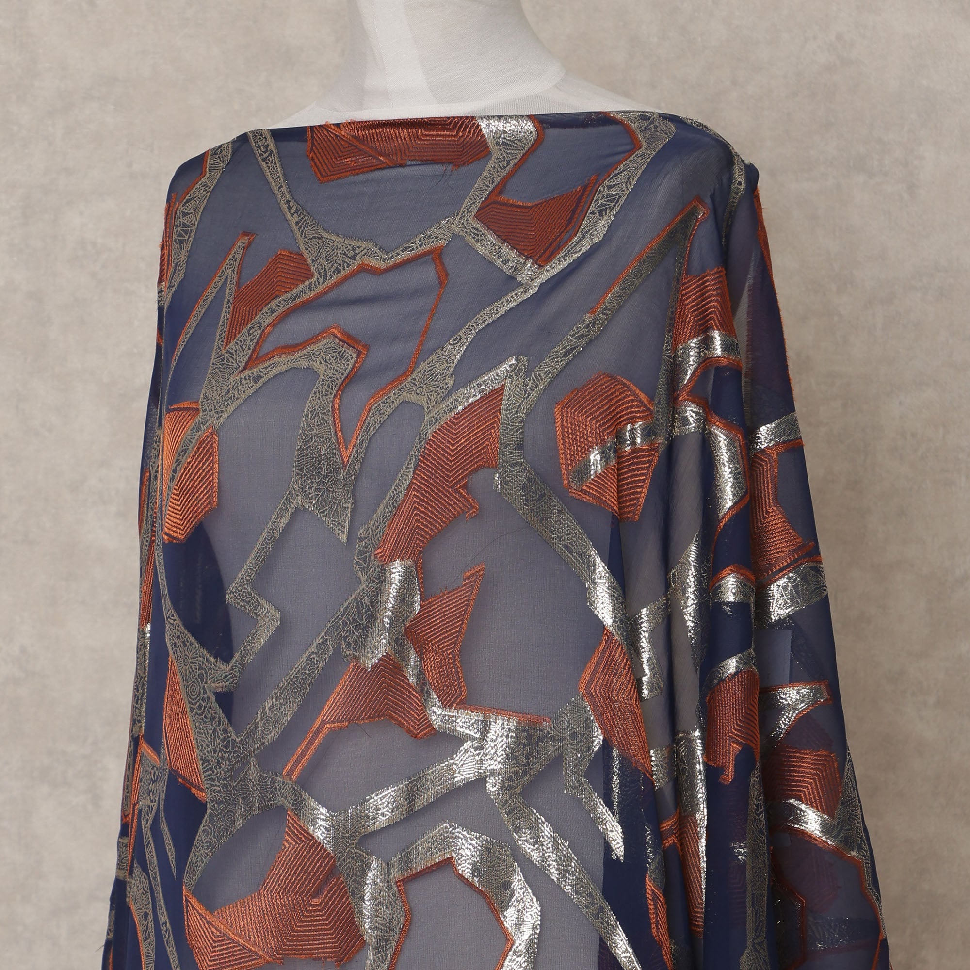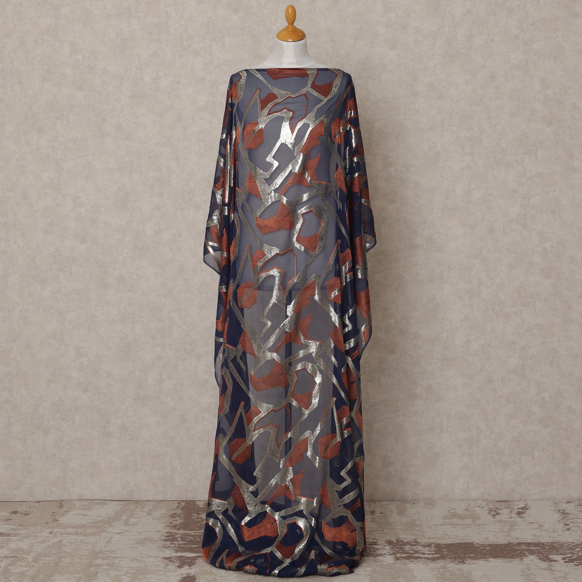 Navy Blue Somali Chiffon Dirac with Rust & Silver Abstract Metallic Lurex Design, 3.5 Mtrs, Width 140 Cms, Made in South Korea-D24038