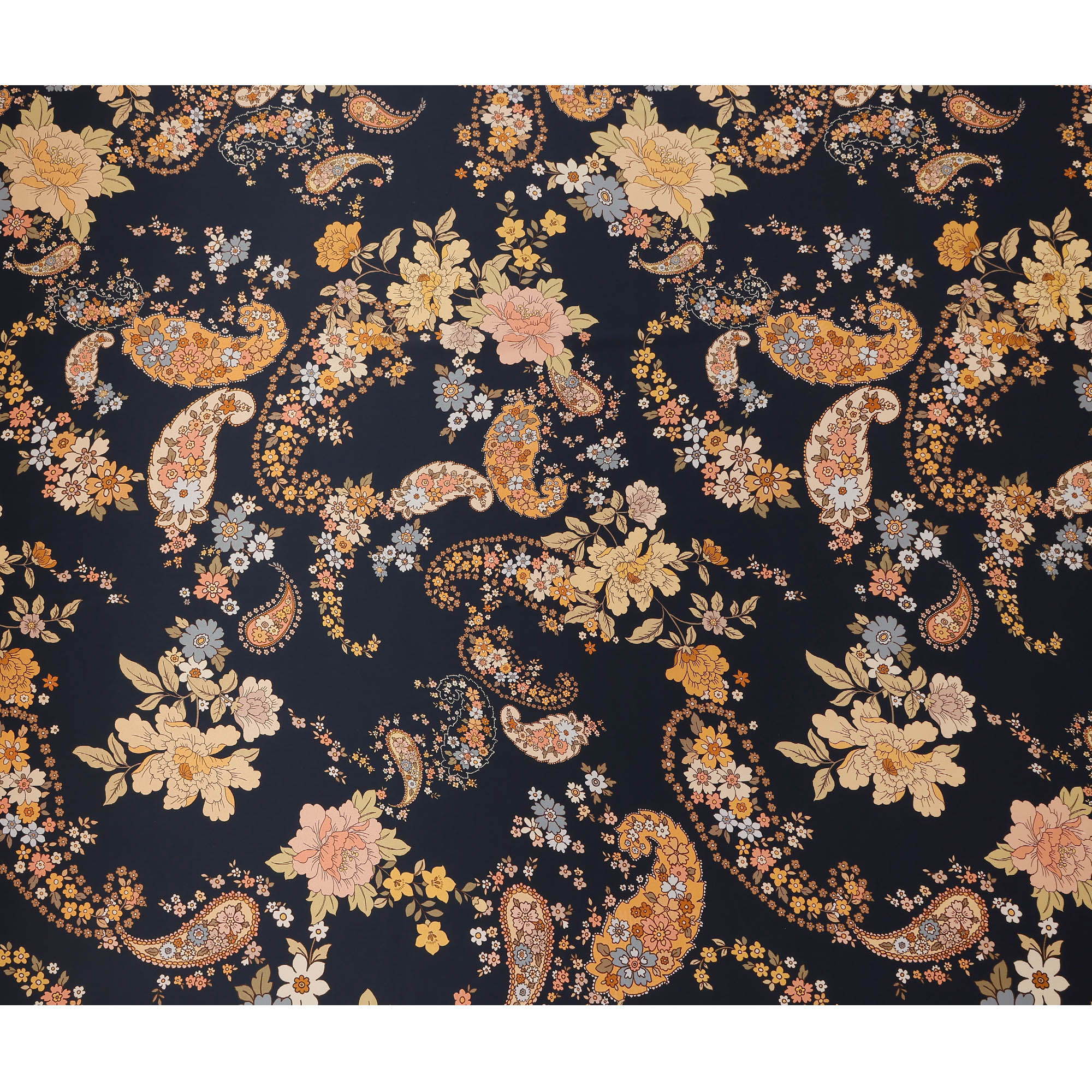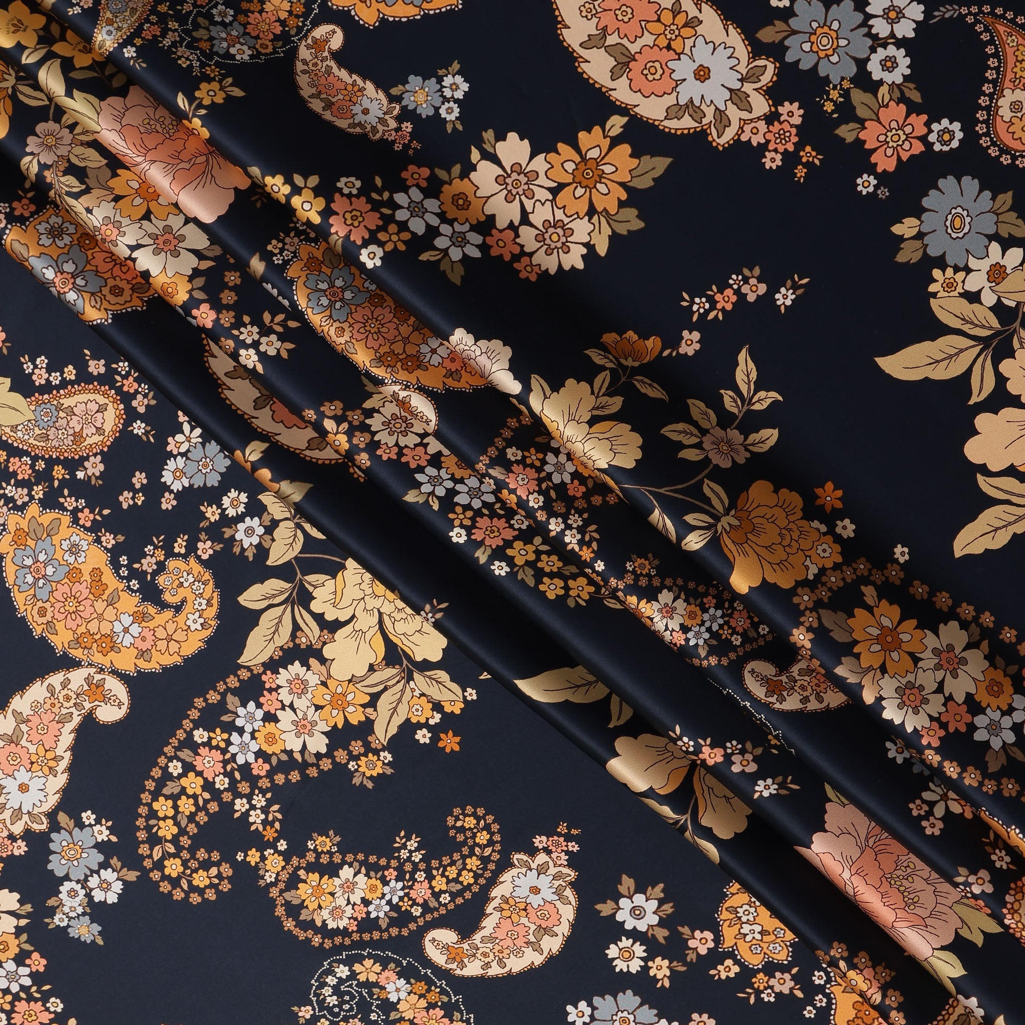 Navy Multicolor Floral Paisley Print Premium Pure Silk Satin Fabric, 110 cm Width, Intricate Designer Pattern, Origin: South Korea-D26813