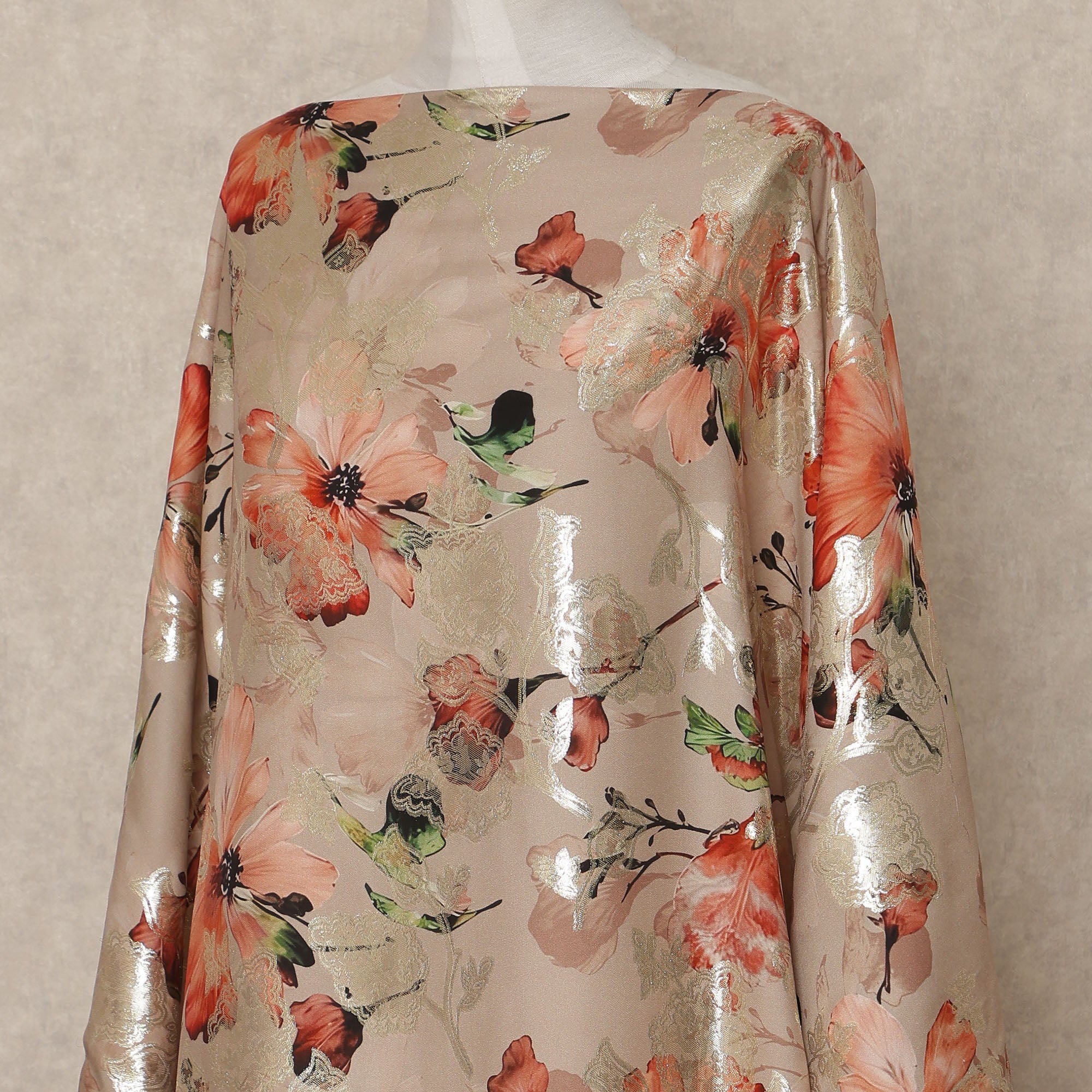 Nude peach base with coral floral print and metallic accents creates a rich elegant look.