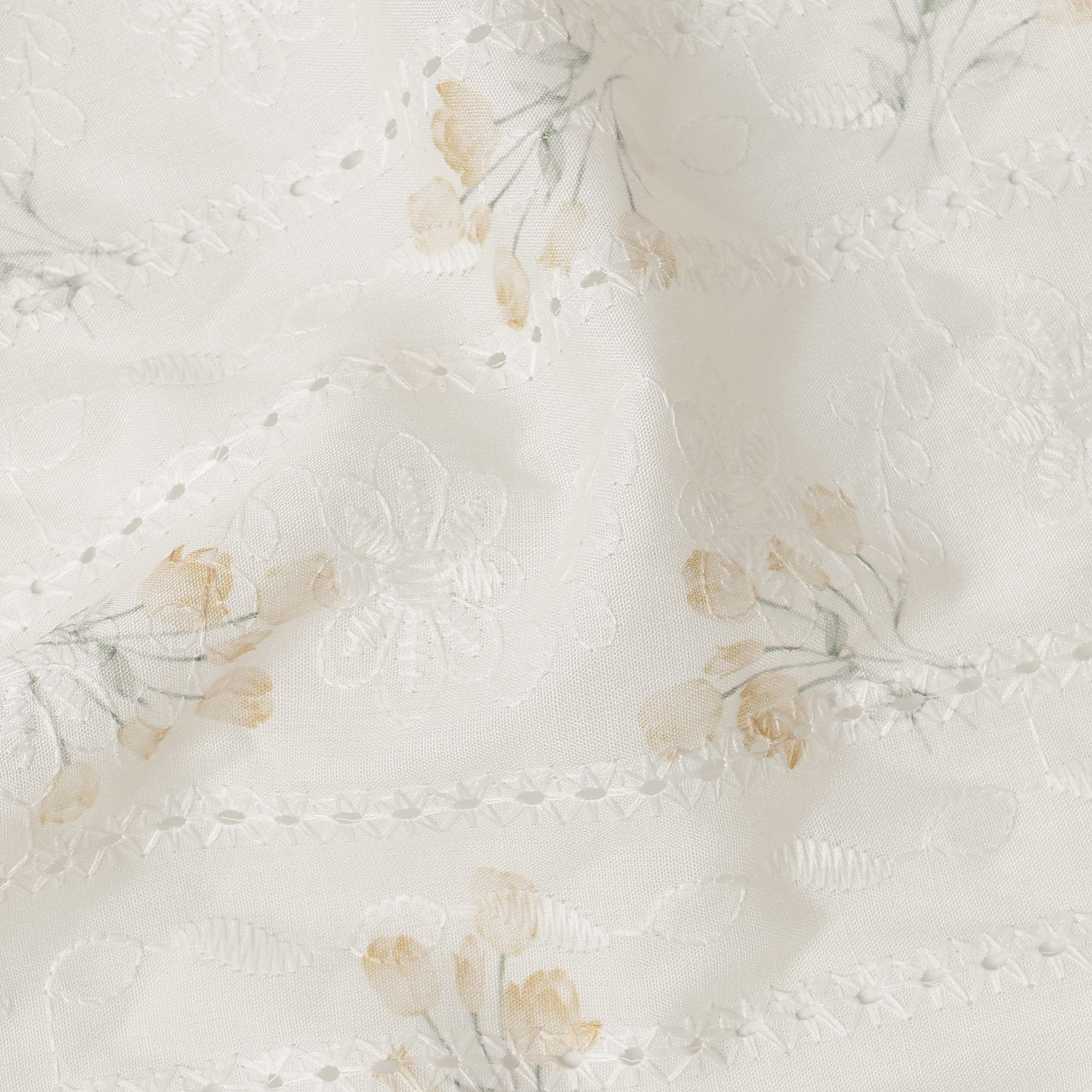 Off White Beige Floral Embroidered Cotton Voile Fabric Soft Sheer Lightweight Design 150 Cms Width Made in India-D27452