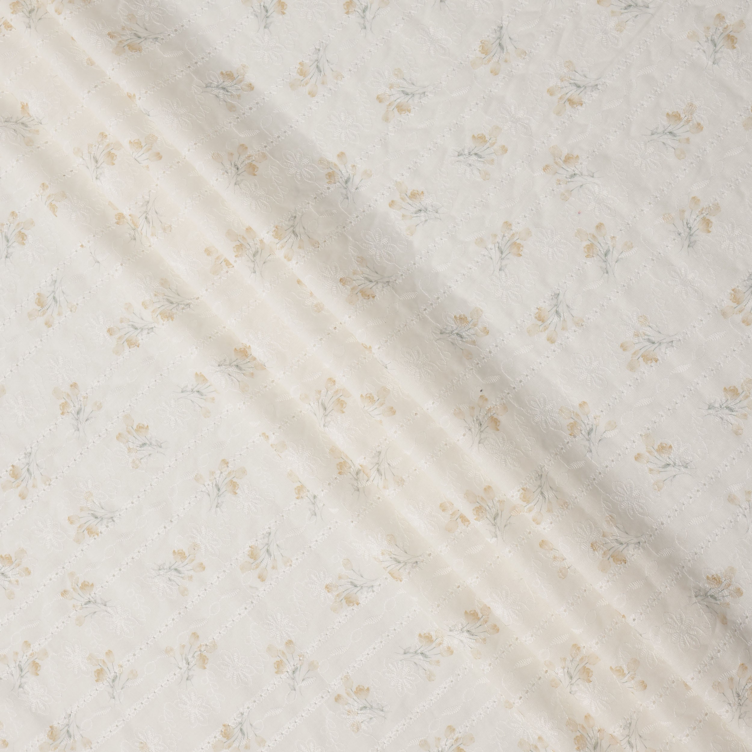 This off white cotton voile embroidery fabric is beautifully detailed with subtle beige floral motifs that create a soft, elegant, and timeless appeal. Made from fine cotton voile, the fabric is lightweight, airy, and highly breathable, making it perfect for warm climates and comfortable everyday wear. The delicate embroidery adds texture and sophistication without overpowering the base, allowing it to suit a wide range of garments such as dresses, kurtis, blouses, dupattas, overlays, and refined ethnic or fusion styles. Its sheer nature enhances fluid drape and graceful movement while remaining easy to cut, stitch, and finish neatly. Ideal for designers, boutiques, and home tailoring projects, this fabric combines comfort, versatility, and understated elegance for refined creations.