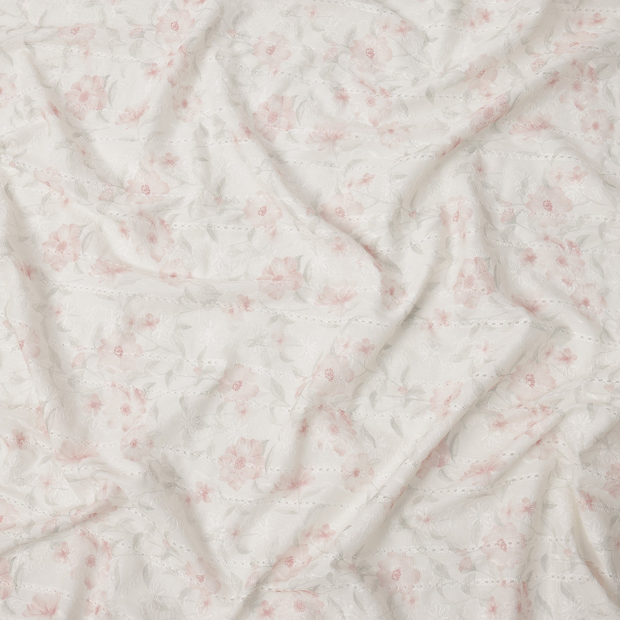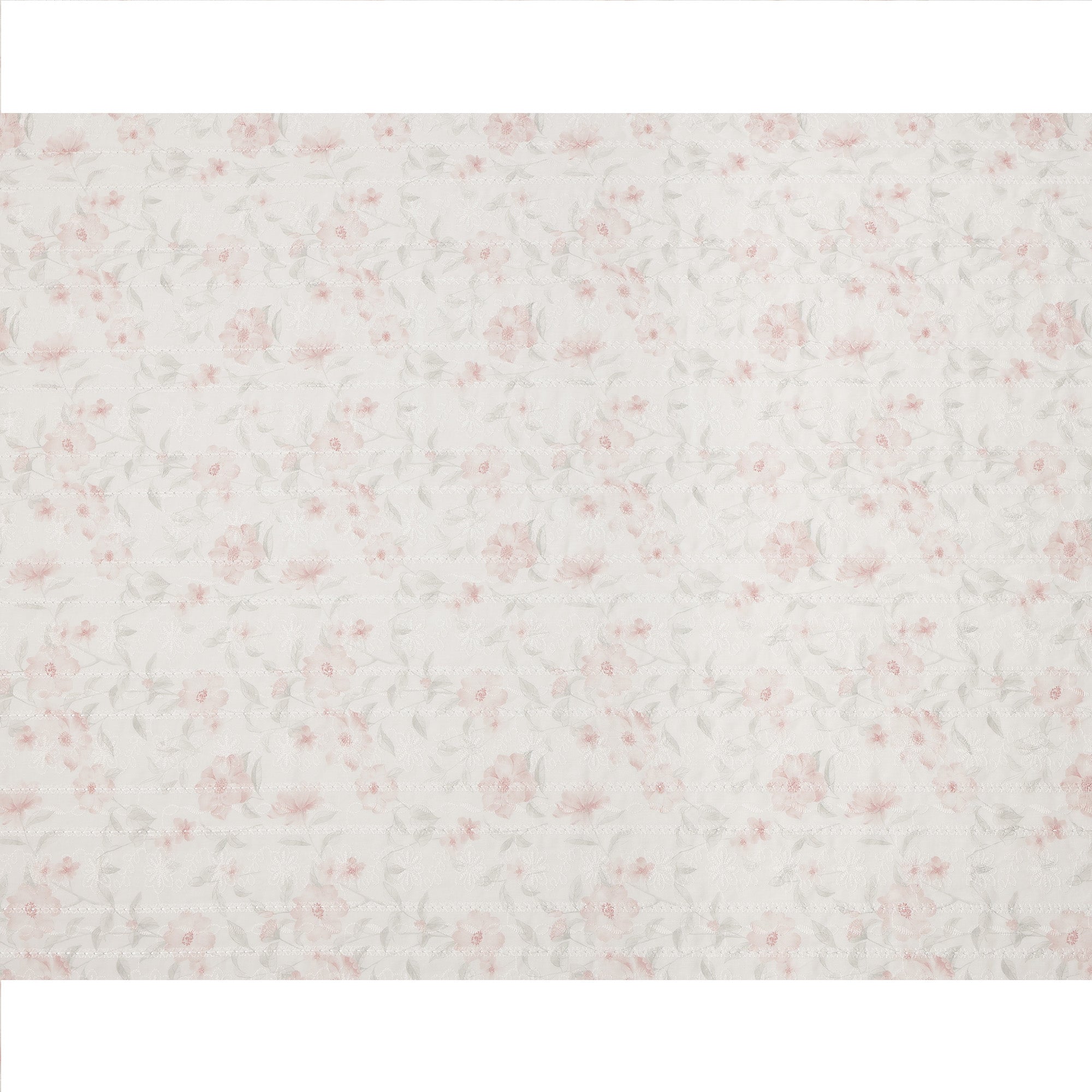 Blush pink floral embroidery enhances the fabric with a soft and elegant appeal