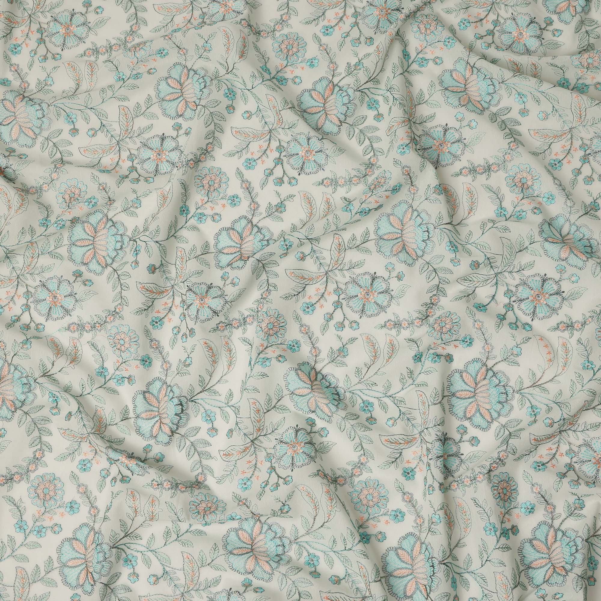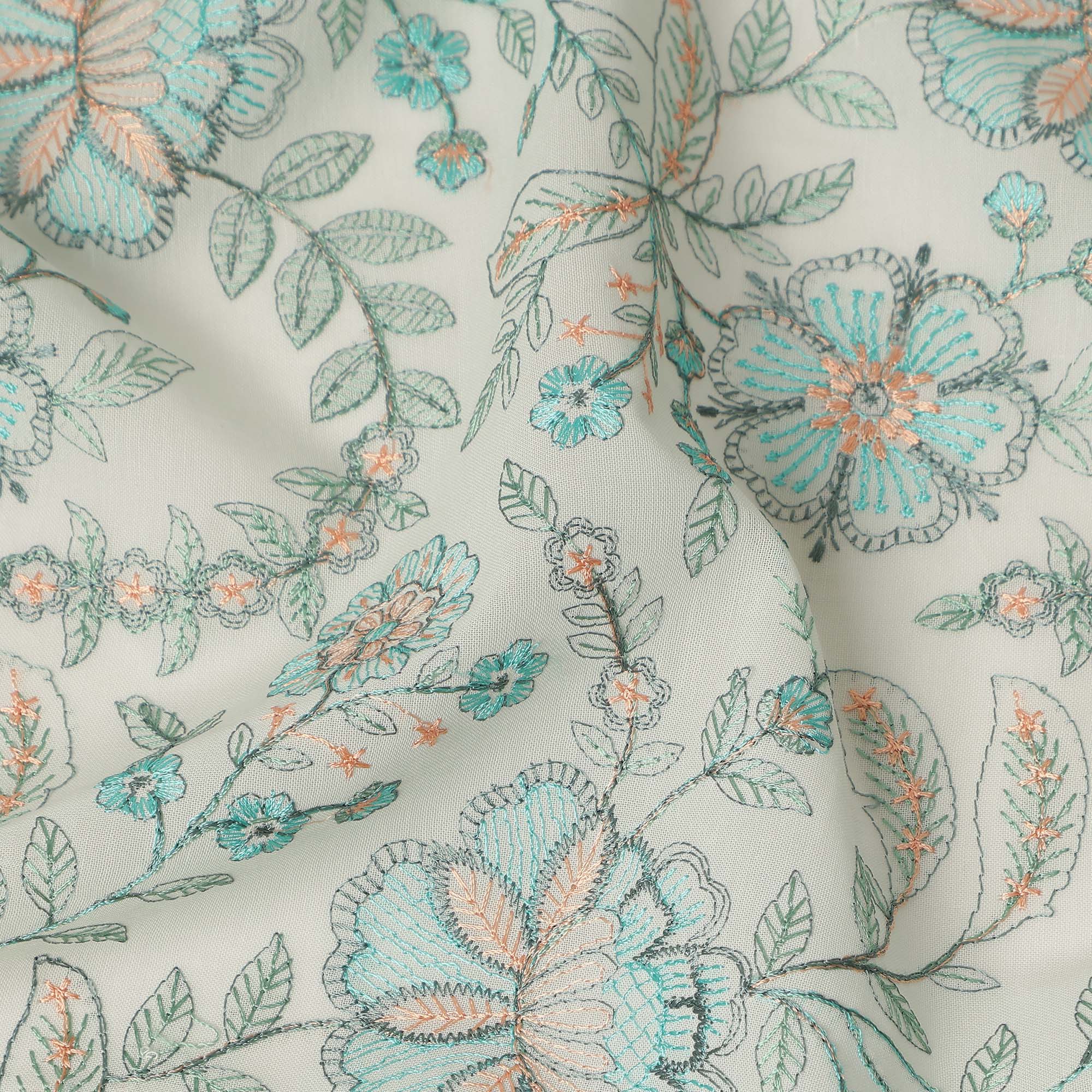 This off white floral embroidered cotton voile fabric blends delicate texture with lightweight comfort, making it an ideal choice for elegant garments and refined sewing projects. The fabric features a soft off white base beautifully enhanced with intricate multicolor floral and botanical embroidery that adds graceful detail and subtle depth to the design. Cotton voile is known for its airy structure, smooth hand feel, and breathable nature, allowing garments to remain comfortable while maintaining a soft flowing drape. With a width of 110 cms, this fabric is perfect for dresses, tops, kurtas, tunics, skirts, scarves, and boutique fashion creations. The combination of breathable cotton fibers and decorative embroidery makes this fabric a wonderful choice for designers, tailors, and sewing enthusiasts looking to create garments that balance comfort, elegance, and timeless floral style for everyday wear or special occasions.