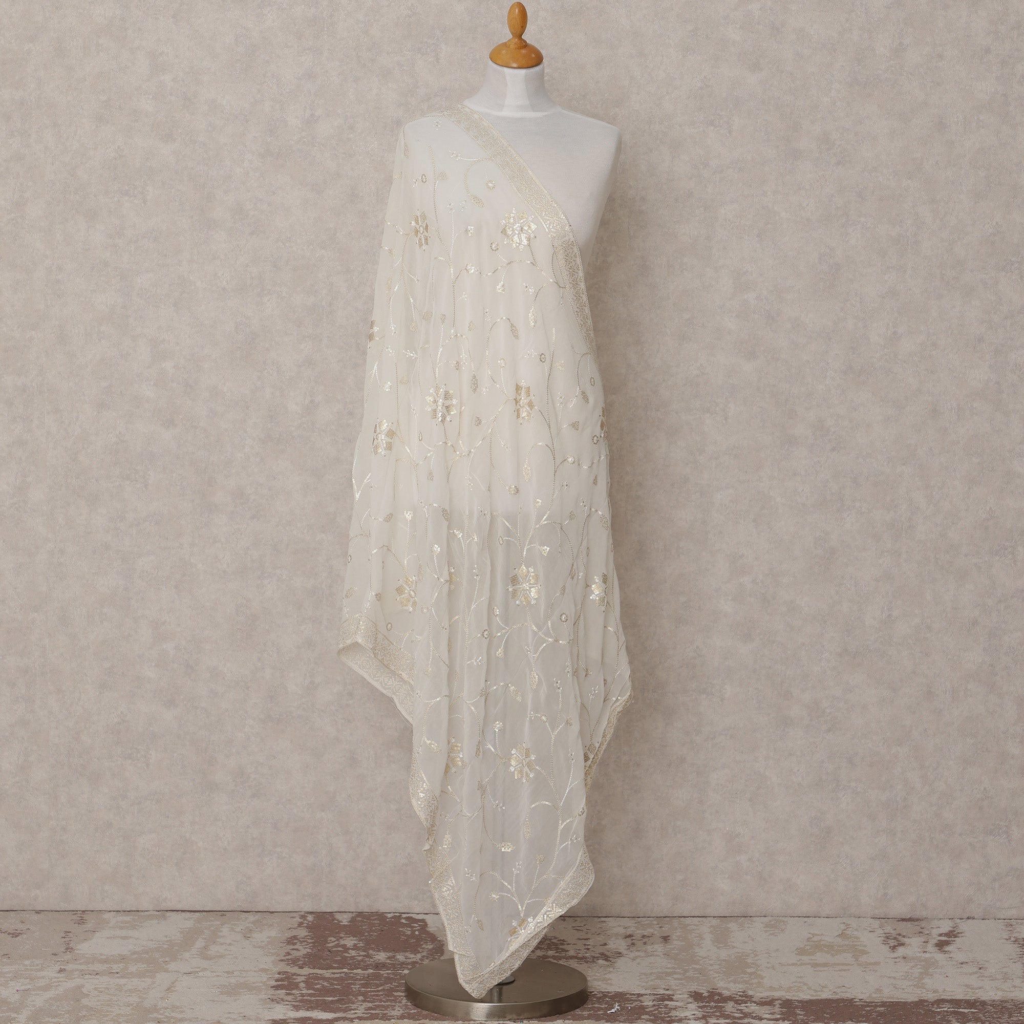 This off white floral motif embroidered synthetic georgette dupatta with sequins is a timeless and elegant piece that adds sophistication... Read more Read more