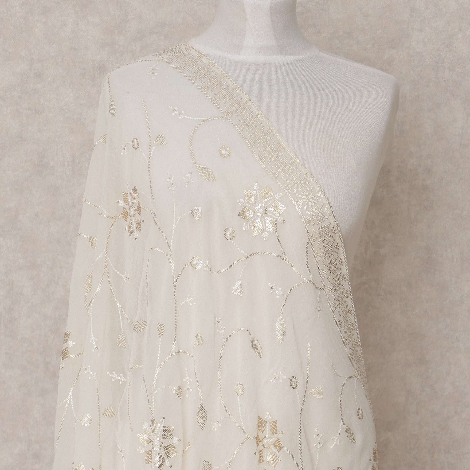 Off White Floral Motif Embroidered Synthetic Georgette Dupatta with Sequins, Size 210X90 Cms, India-D24849