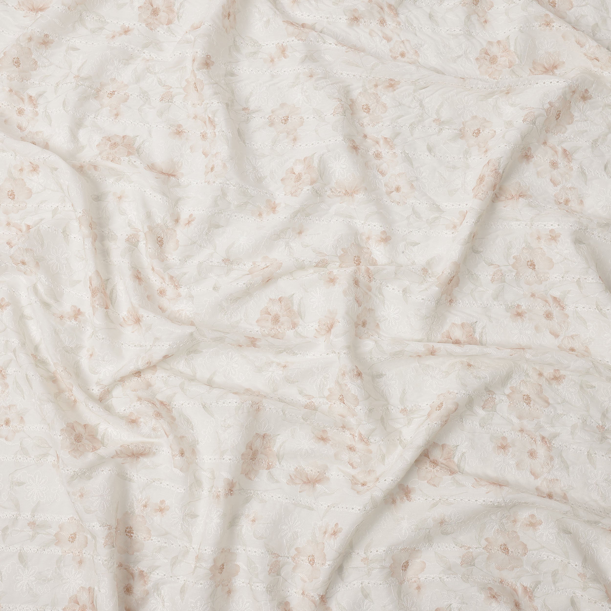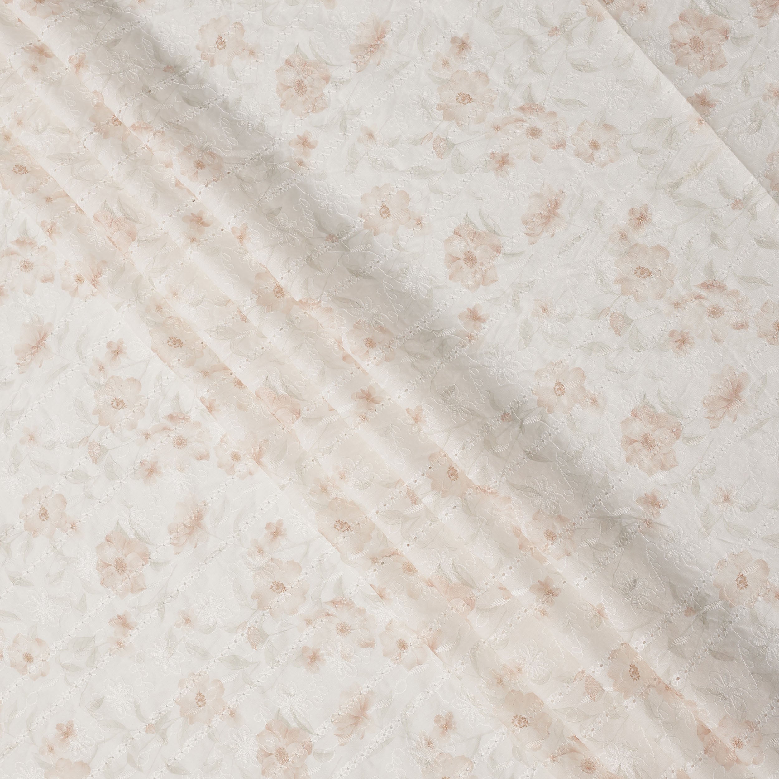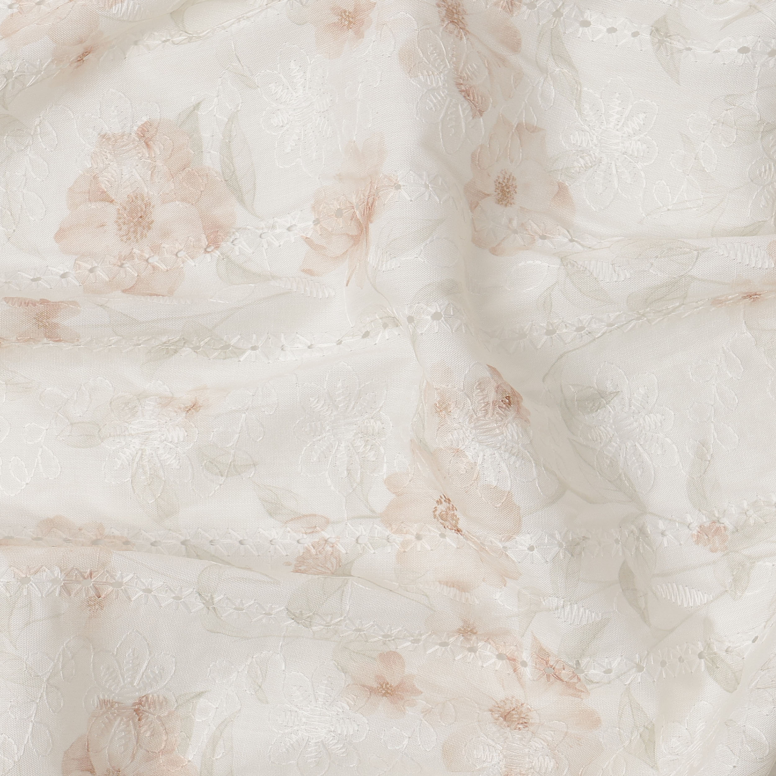 This off white cotton voile embroidery fabric is designed to offer a soft, airy feel with an elegant peach floral... Read more Read more