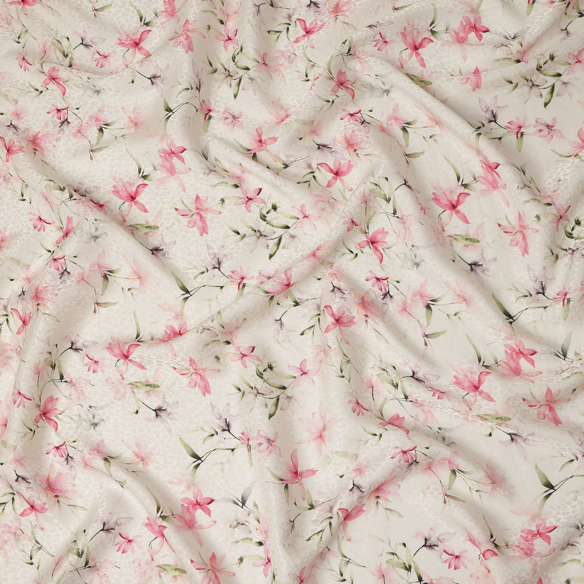 This off white pink floral printed viscose crepe fabric features delicate pink blossoms with soft green leaves gracefully scattered across... Read more Read more