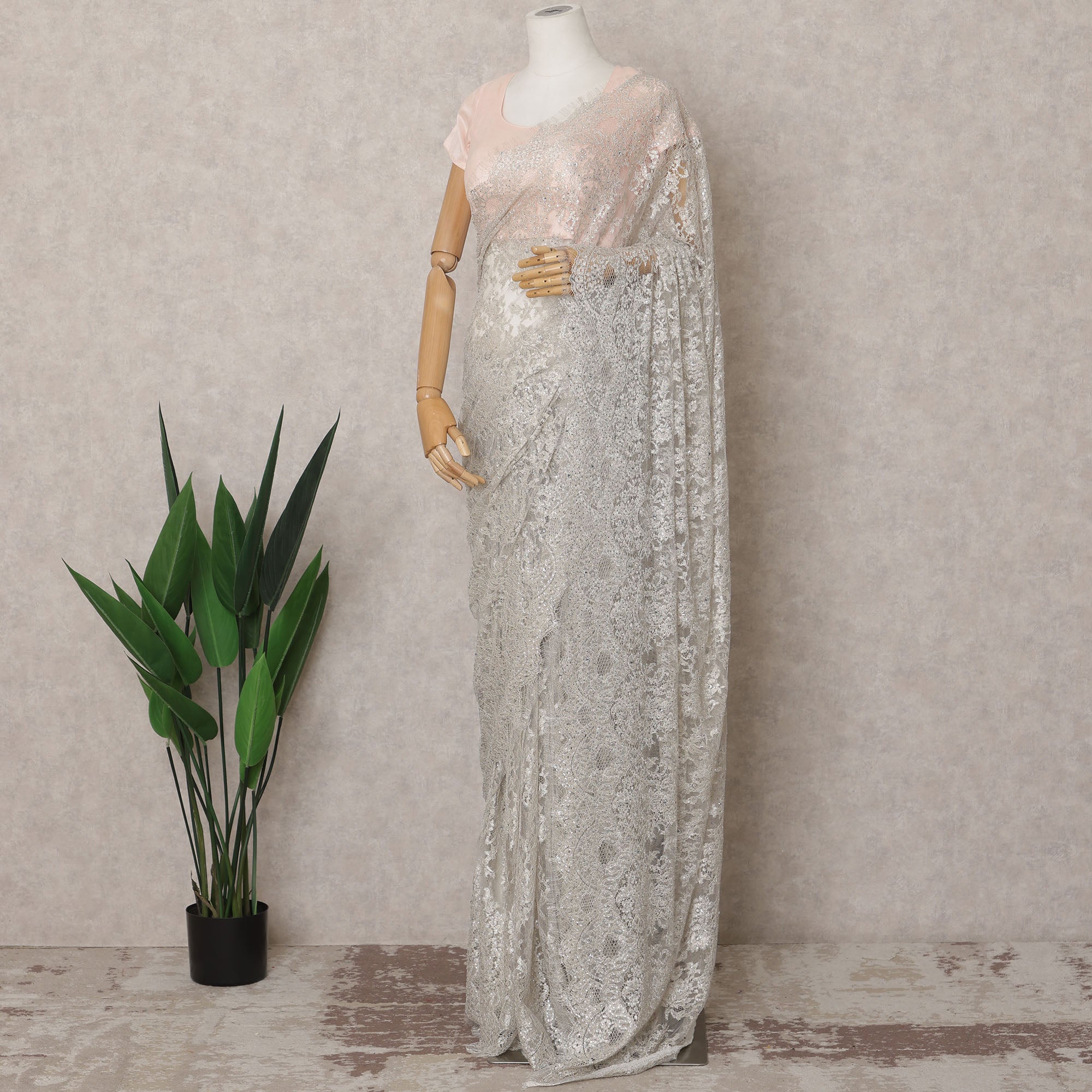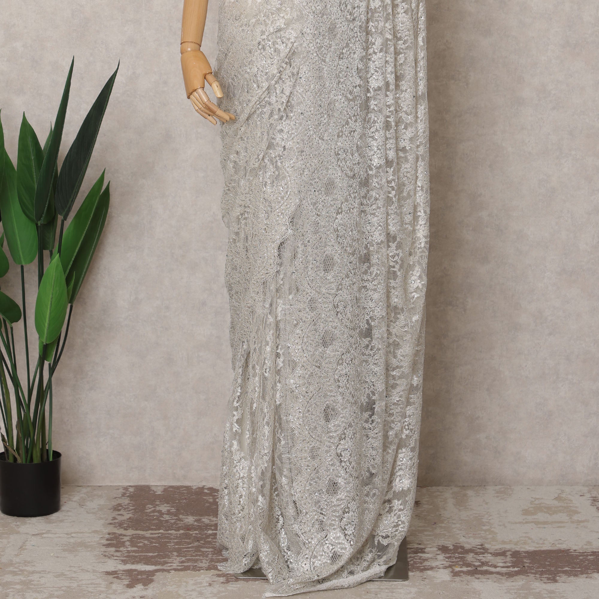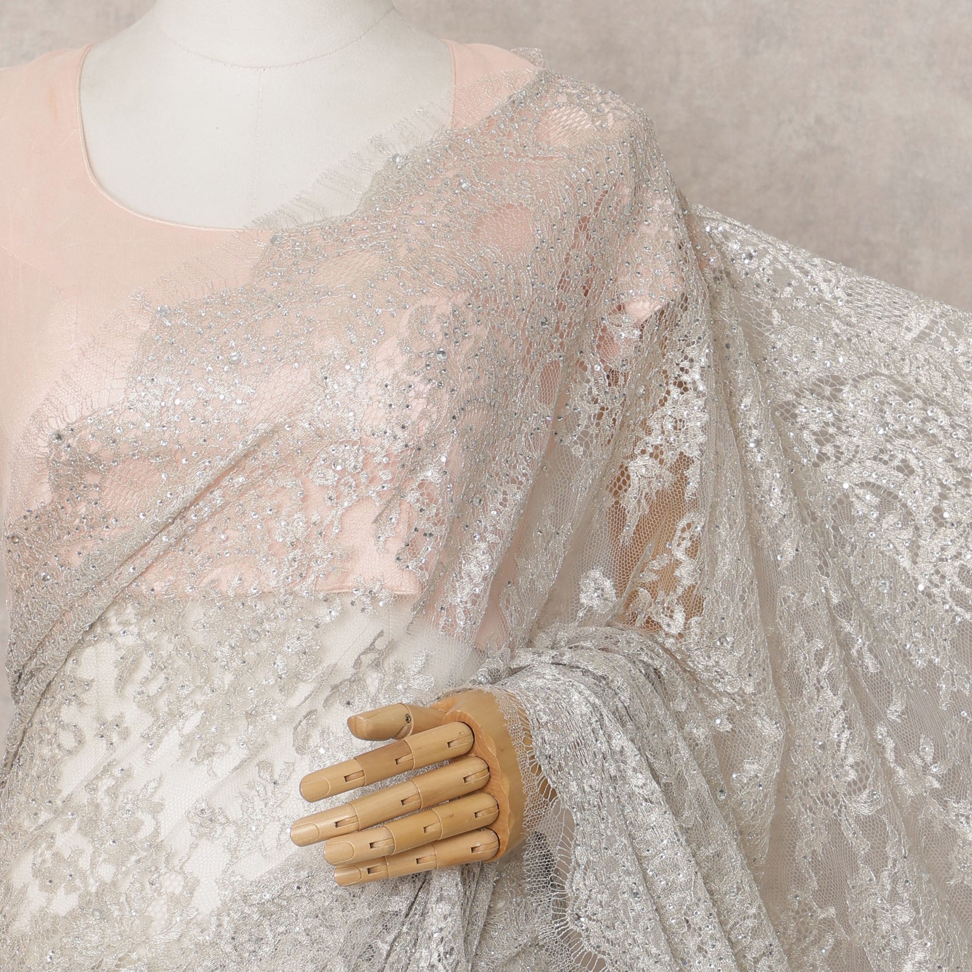 Off White Premium French Metallic Chantilly Lace Saree Fabric with Stone Work – 5.5 Meters Length & 110 Cms Width – Imported from France-D22932