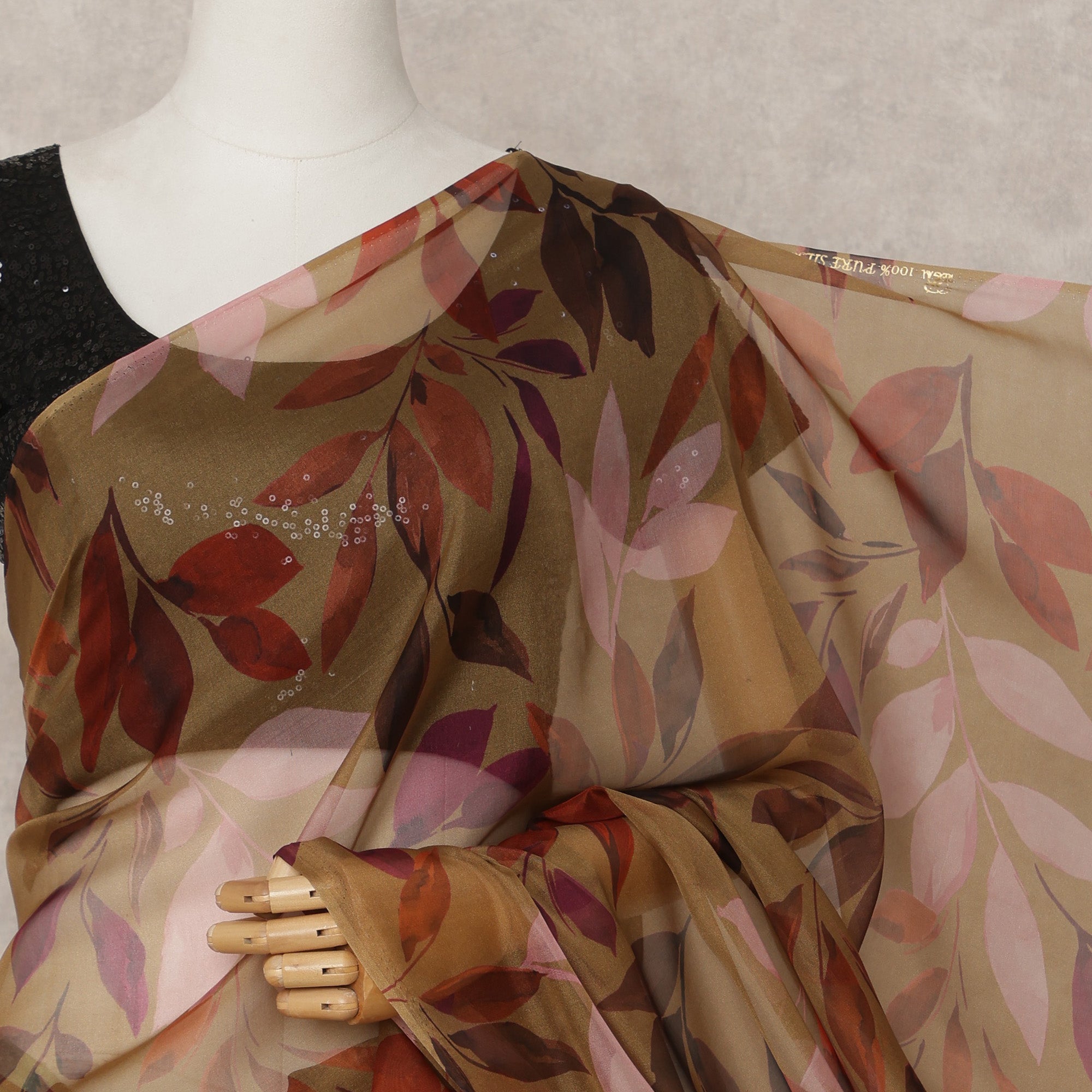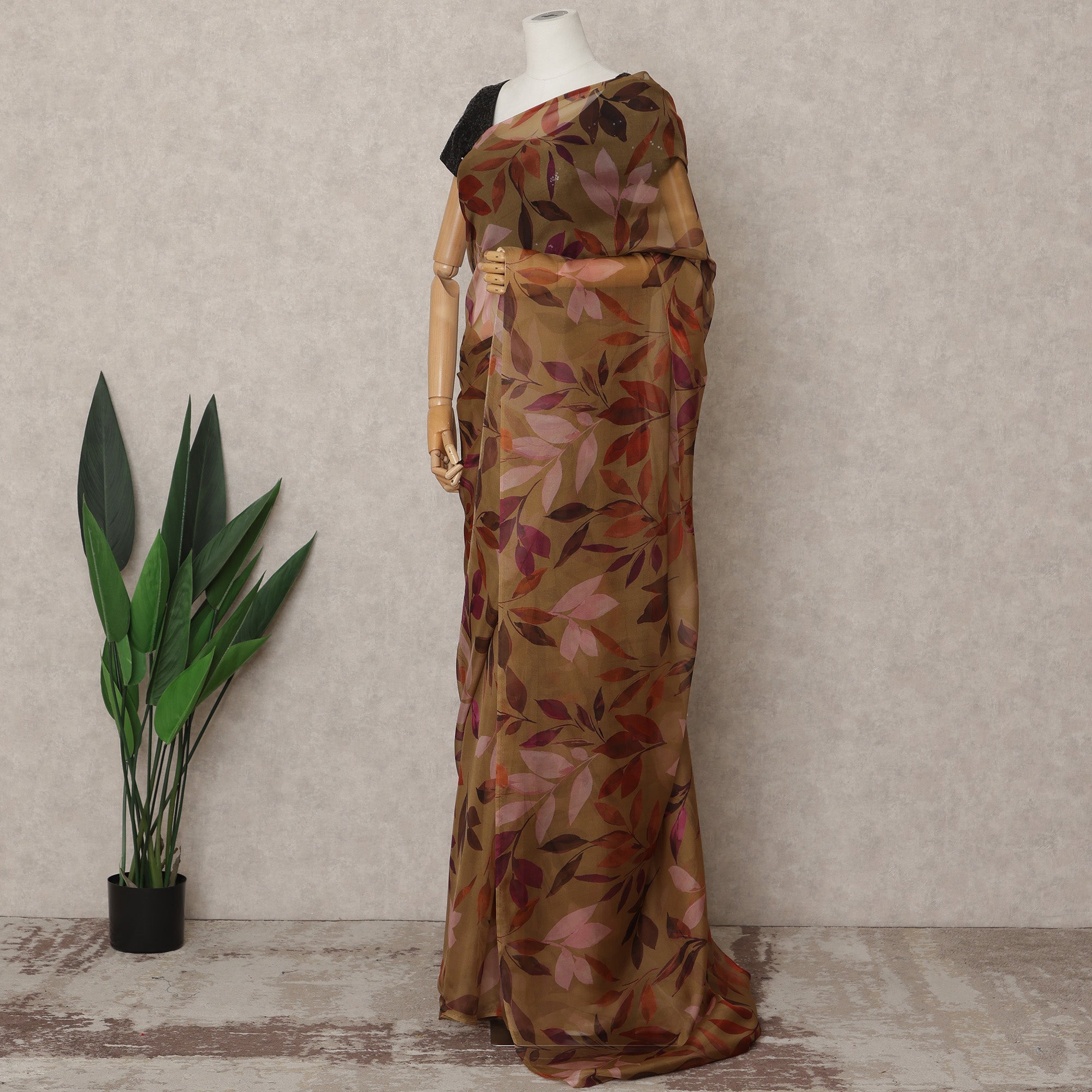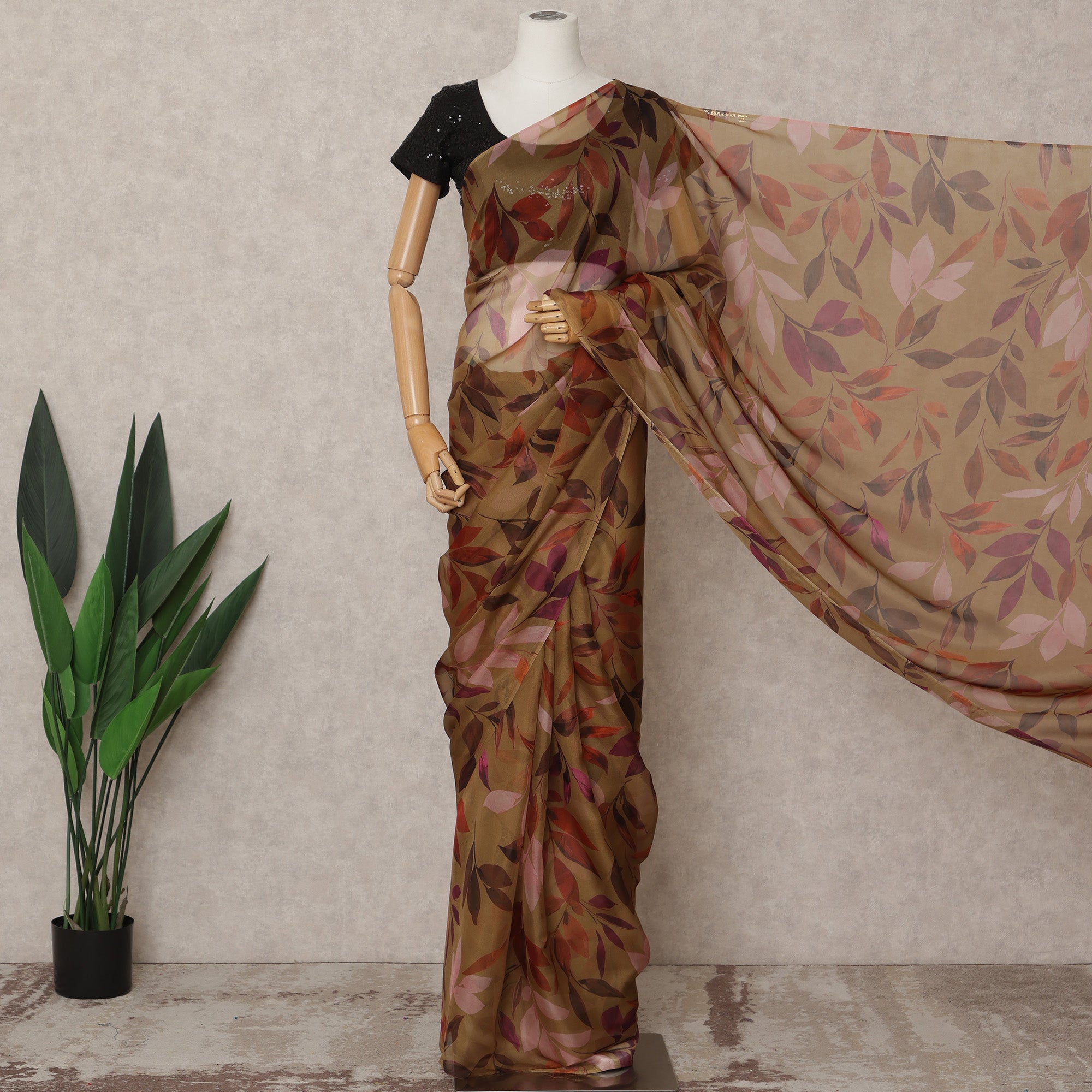 Olive Brown Premium Pure Silk Chiffon Leaf Printed Saree, 5.5 Mtrs Length, 110 Cms Width, Made in India-D24230