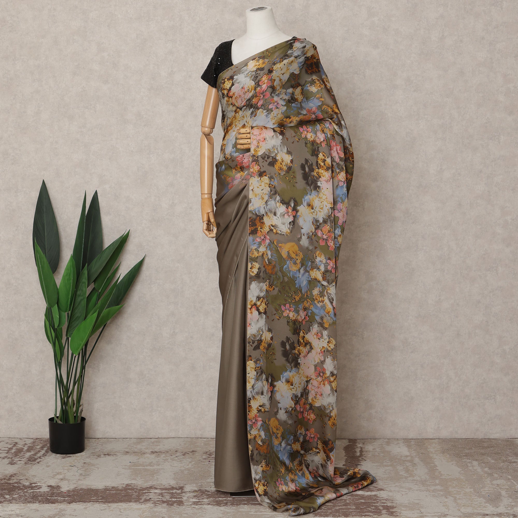 Unveil effortless elegance with this olive brown premium pure silk chiffon saree, featuring a captivating contrast of floral printed pallu and solid pleated body that brings a unique blend of grace and sophistication. The rich olive brown base drapes smoothly, offering a sleek silhouette while the digitally printed floral pallu explodes in vibrant hues of coral, blue, ivory, and golden yellow, evoking the freshness of a spring garden. Expertly crafted in India, this saree is woven from luxurious silk chiffon known for its lightweight texture and ethereal flow, ideal for both festive and formal occasions. With a length of approximately 5.5 meters and a width of 110 centimeters, it provides ample scope for effortless draping and layering. The contrast of print and plain makes this saree an exquisite statement piece for women who appreciate refined aesthetics with a touch of tradition. Blouse piece not included. For best results, dry clean or gently hand wash to preserve its silk sheen and print brilliance.