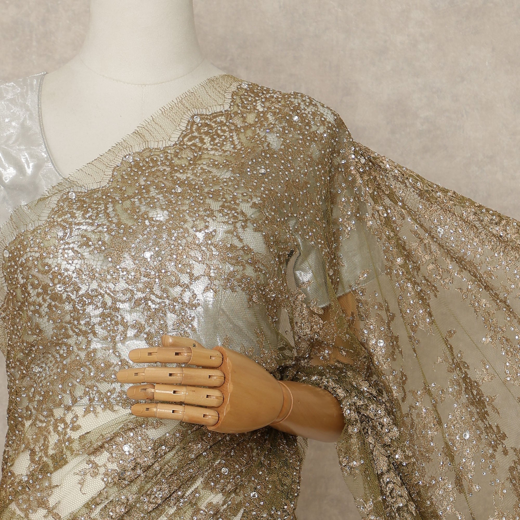 Olive Gold Premium French 2 Tone Chantilly Saree Lace With Stone Work Fabric 5.5 Meters Length 110 Cms Width Imported From France Elegant Designer Lace Blouse Not Included-D27375