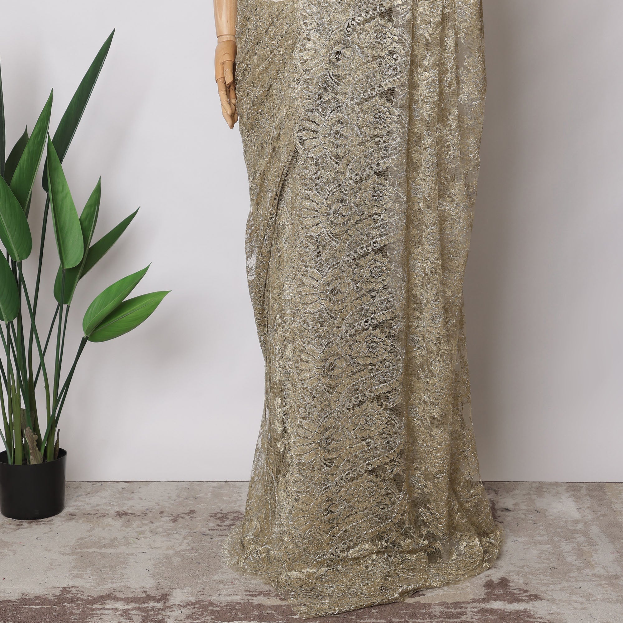 Enhance your ensemble with this luxurious olive gold French metallic Chantilly saree lace fabric, featuring intricate floral designs and a captivating metallic sheen. This premium lace, crafted in France, combines elegance with sophistication, making it an excellent choice for sarees, lehengas, and couture gowns. With a width of 110 cm and a length of 5.5 meters, it provides ample material for creating stunning and versatile designs. The lightweight and sheer texture ensures graceful draping, making it perfect for weddings, festive occasions, and high-end couture. Please note: the blouse shown is for display purposes only and is not included.