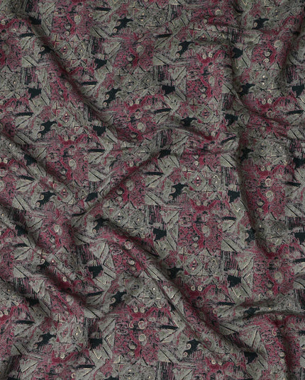 Add an earthy yet artistic edge to your designs with this olive green and maroon blended viscose fabric featuring a tribal-inspired geometric print in a symmetrical layout. Accented with black and beige tones, the intricate design is brought to life with subtle metallic highlights that lend a soft shimmer across the fabric. The bold yet balanced color palette makes it ideal for ethnic wear, fusion garments, and statement accessories. Crafted from a high-quality viscose blend, it offers a smooth finish, breathable comfort, and an elegant drape that flatters various silhouettes. Measuring 110 cms in width, this fabric is well-suited for creating kurtas, tunics, stoles, or festive pieces with a touch of rustic charm. Made in India, it beautifully reflects cultural influence with modern textile finesse. Shop online to discover a versatile and visually striking fabric for your next creation.