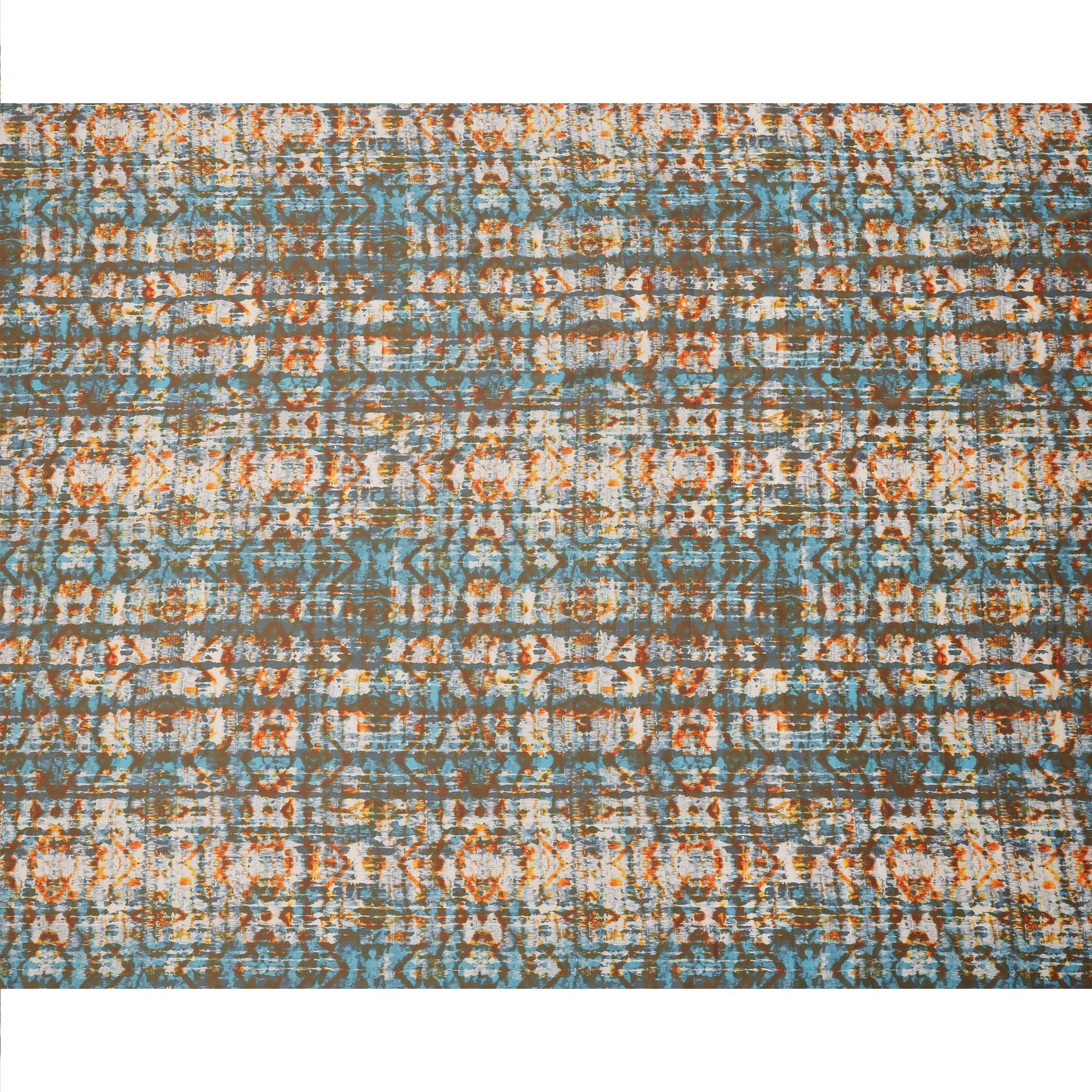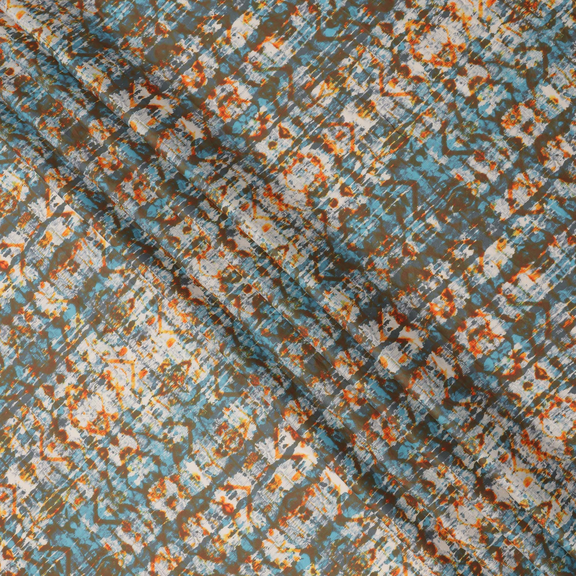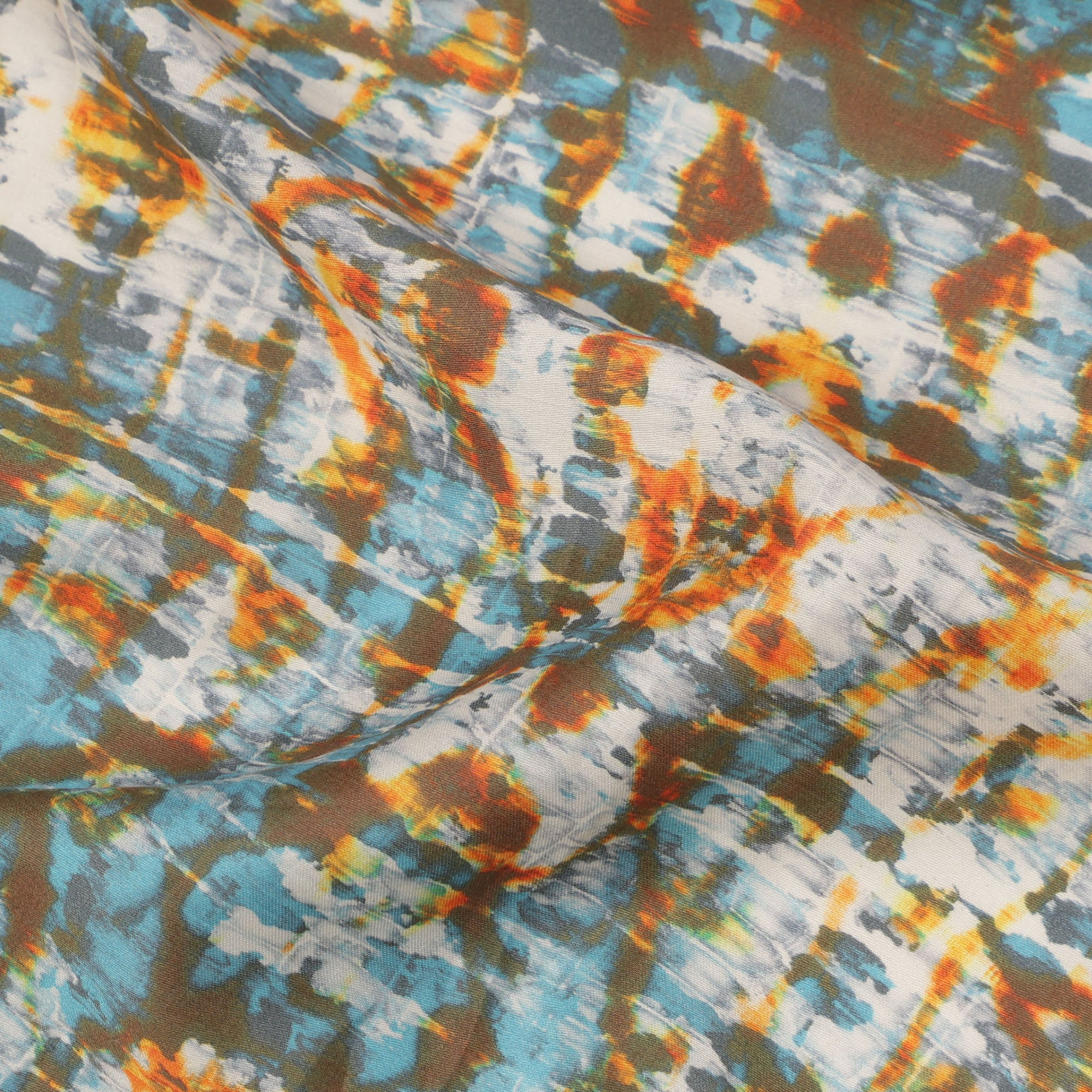 Olive Green Cotton Lawn Fabric with Blue and Orange Tie-Dye Inspired Print, Width 110 Cms, Made in India-D23943