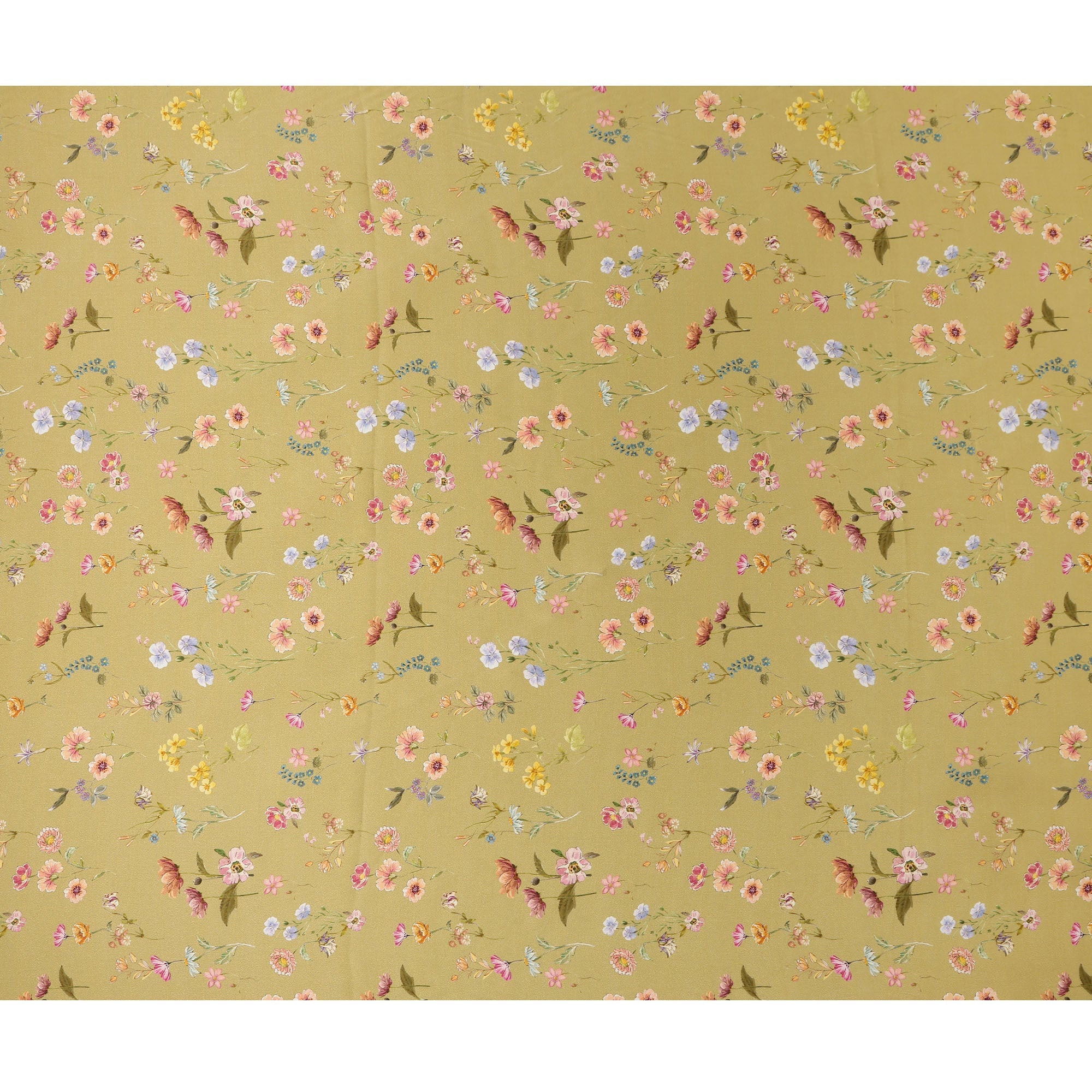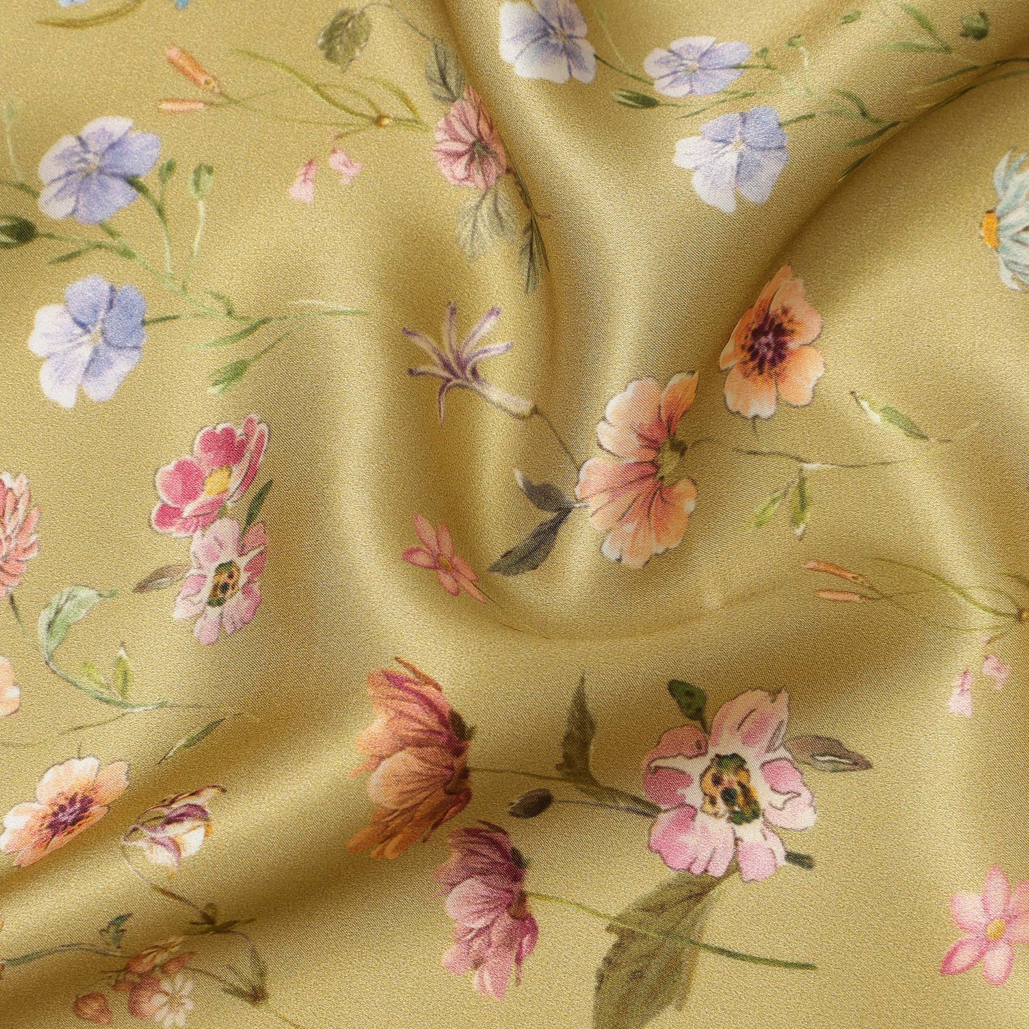Olive Green Delicate Floral Allover Printed Premium Pure Silk Satin Fabric, 110 Cms, India-D27090