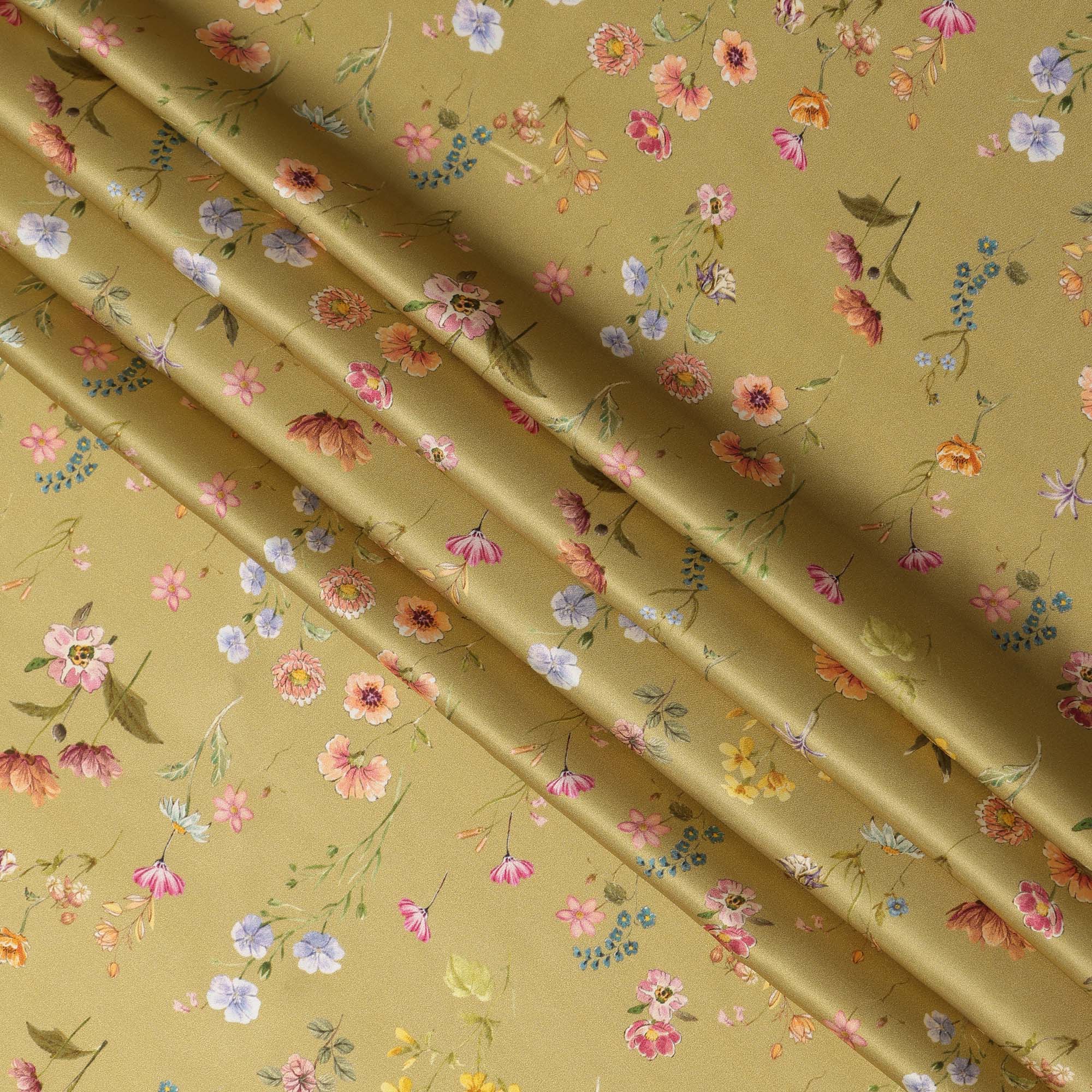 This Olive Green Delicate Floral Allover Printed Premium Pure Silk Satin Fabric brings together understated luxury and refined elegance inspired by nature. The soothing olive green base is gracefully enhanced with finely detailed floral motifs in soft blush pink, pastel blue, warm peach, lilac, and muted yellow tones, creating a harmonious and elegant visual balance. Crafted from premium pure silk satin, the fabric offers a naturally rich sheen, ultra-smooth texture, and a fluid drape that flows beautifully with every movement. Lightweight yet opulent, it is ideal for sarees, designer blouses, dresses, gowns, dupattas, lehengas, and contemporary fusion wear. The generous 110 cms width allows efficient cutting and effortless tailoring. Perfect for festive occasions, daytime celebrations, and elegant evening wear, this Indian-made silk satin fabric reflects superior craftsmanship, long-lasting quality, and timeless aesthetic appeal.