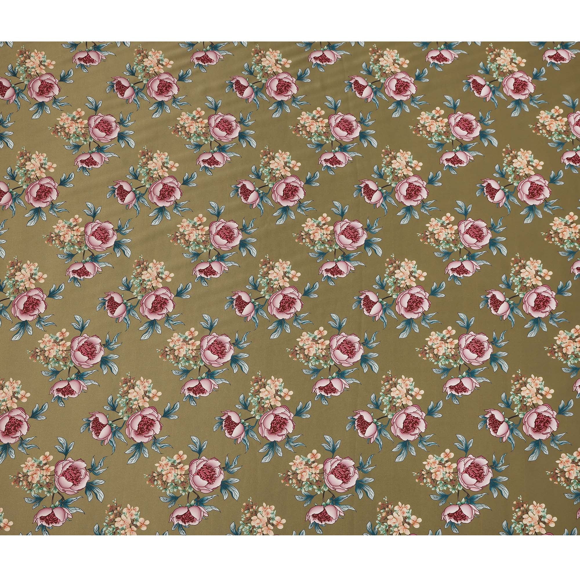 Olive Green Floral Allover Printed Premium Pure Silk Satin Fabric, 110 Cms, China-D27072