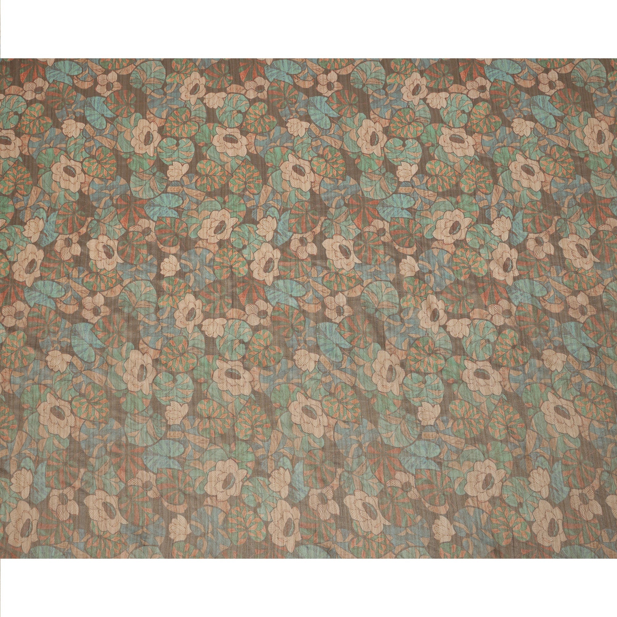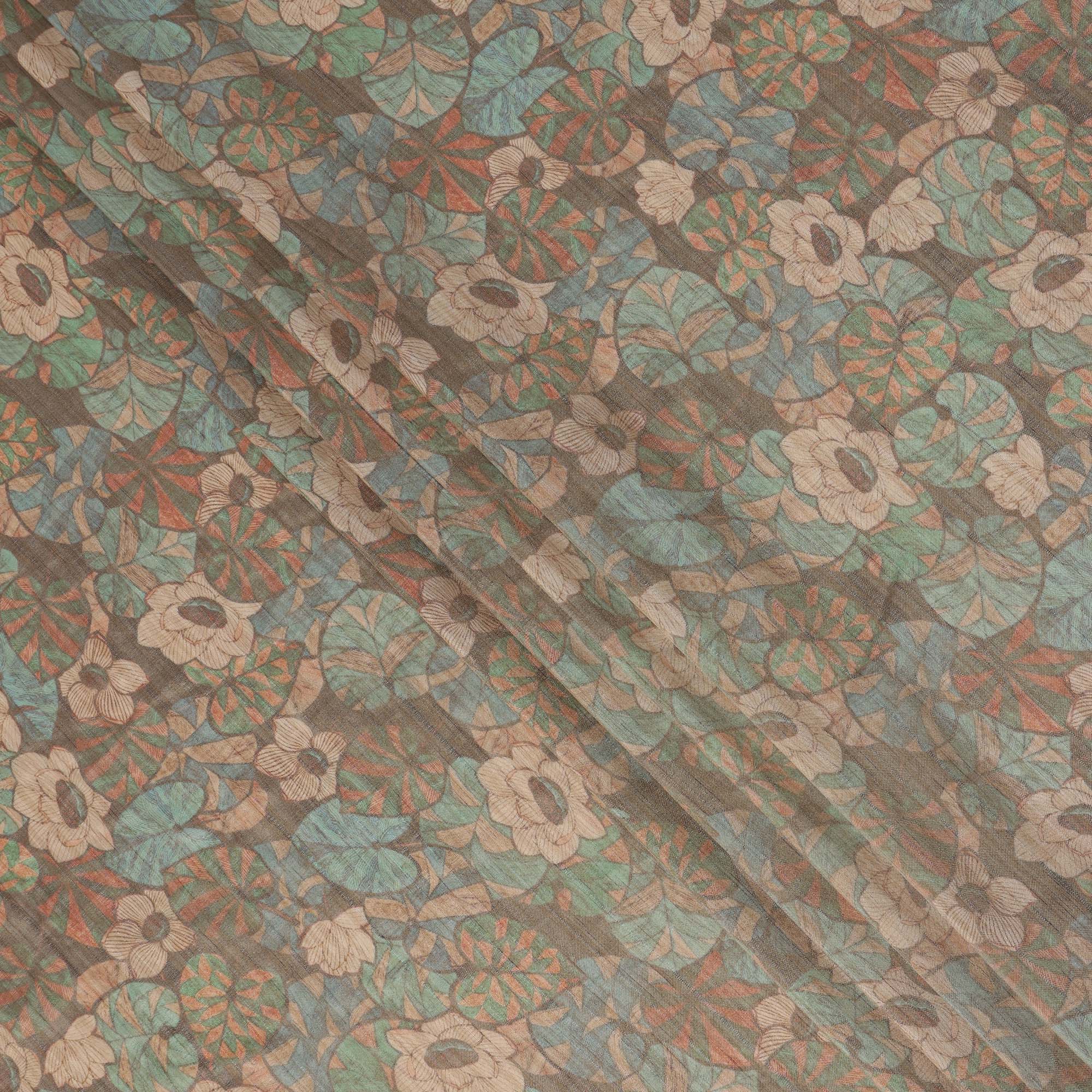 Olive Green Floral and Leaf Motif Viscose Tussar Fabric with Beige and Rust Accents, 110 Cms Width, Made in India-D24339