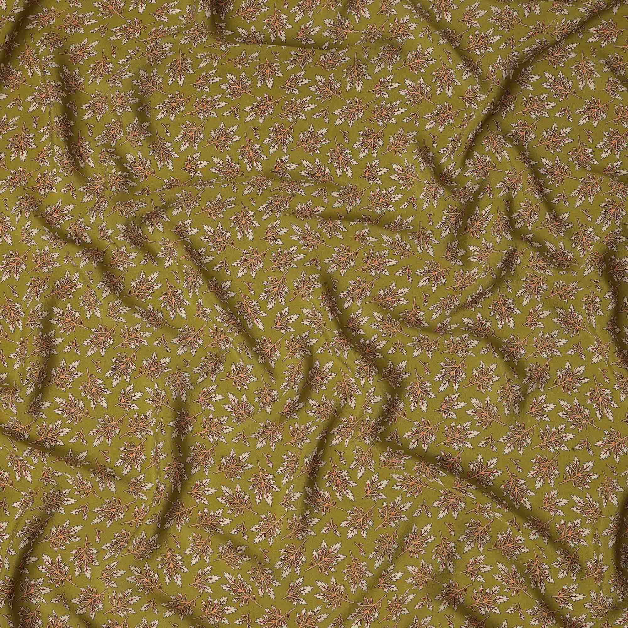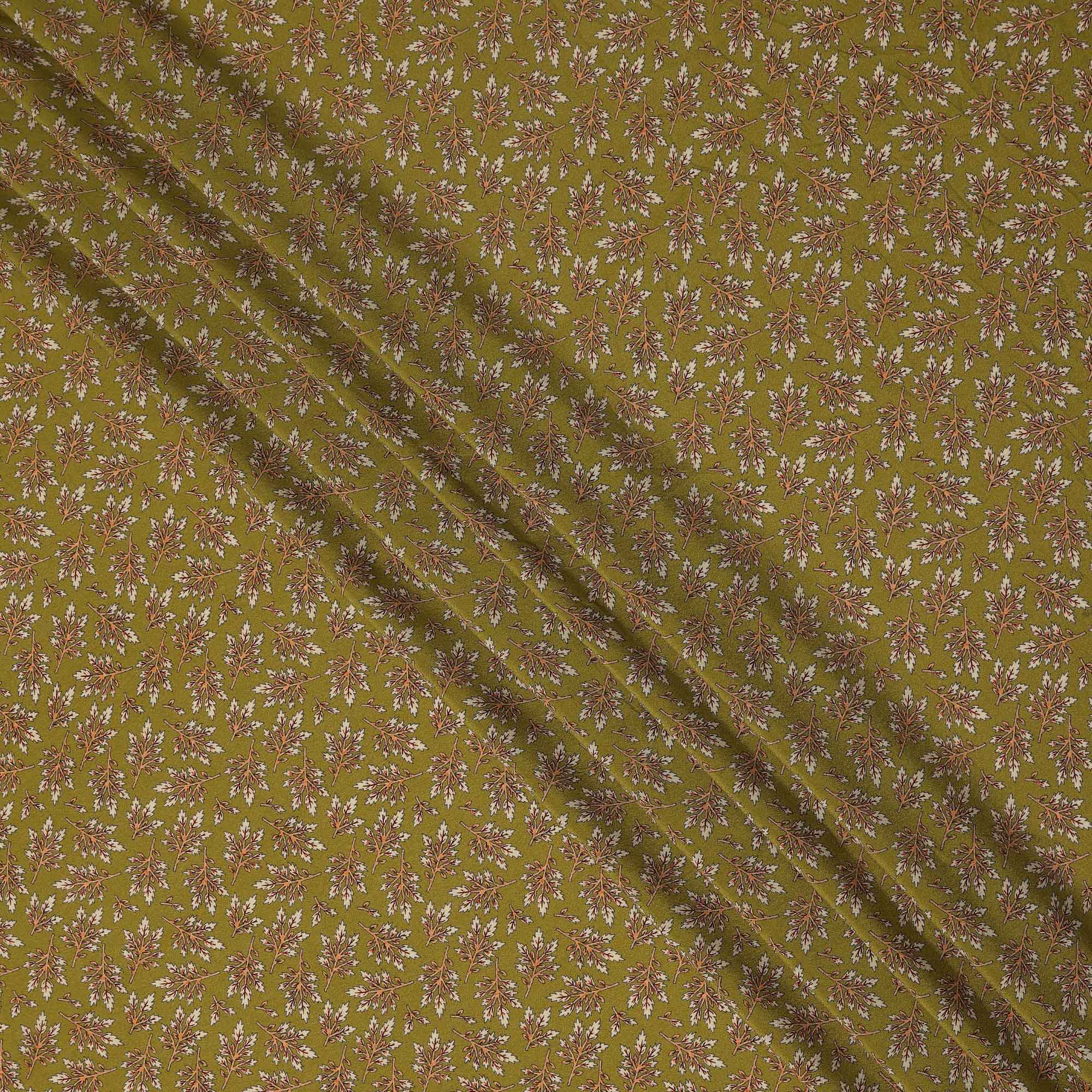 Olive Green Leaf Printed Premium Pure Silk Crepe Fabric Small Botanical Motif Design Soft Lightweight Dress Material 110 Cms Width India-D28013
