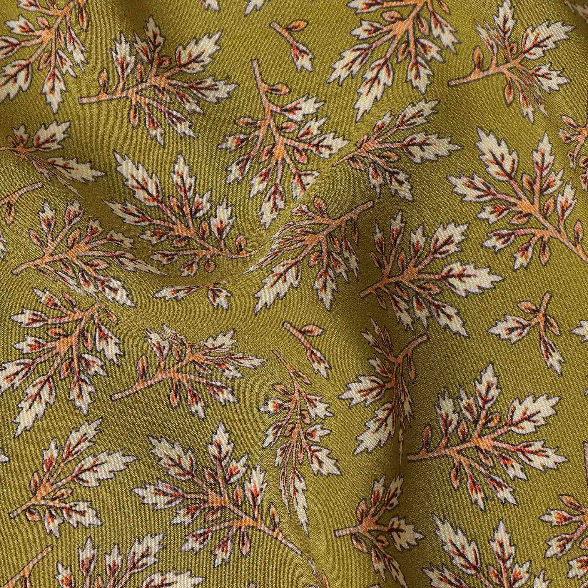 This olive green leaf printed premium pure silk crepe fabric features a refined small botanical motif design delicately scattered across a rich olive green base, highlighted with subtle beige and earthy brown accents. Crafted from high quality pure silk crepe, it offers a luxuriously smooth texture with a soft matte finish and a graceful fluid drape that flatters both structured and flowing silhouettes. The lightweight and breathable composition ensures exceptional comfort for extended wear, making it perfect for dresses, blouses, skirts, scarves, and elegant ethnic ensembles. With a width of 110 cms, this fabric provides versatile scope for creative tailoring and designer projects. Ideal for boutiques, fashion designers, and sewing enthusiasts, it blends understated natural tones with intricate detailing to create timeless garments suitable for festive occasions and sophisticated everyday styling.