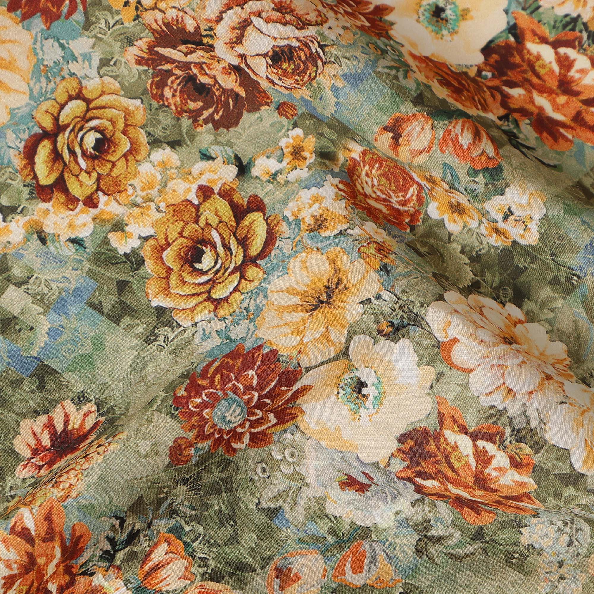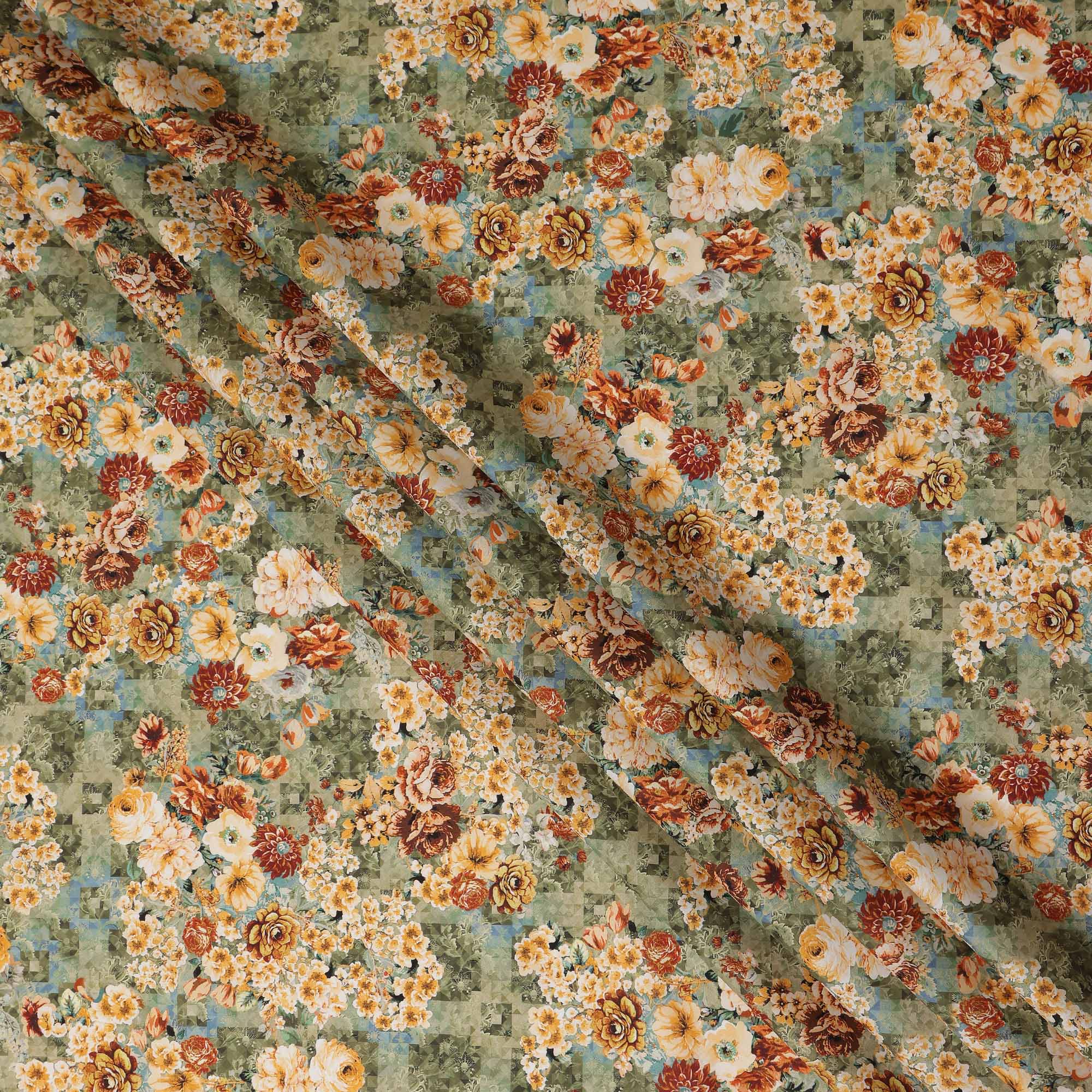 This olive green multicolor floral bouquet printed cotton satin fabric features a rich earthy green base beautifully enhanced with blooming florals in shades of mustard, rust, ivory, peach, and soft blue arranged over a subtle geometric backdrop. The harmonious blend of warm and natural tones creates a timeless and elegant appeal suitable for both contemporary and traditional styles. Crafted from premium cotton satin, the fabric offers a smooth hand feel with a soft natural sheen that adds refinement to every creation. With a width of 110 cms, it provides ample usability for dresses, skirts, blouses, festive wear, and statement ethnic outfits. The breathable cotton composition ensures comfort, while the satin weave delivers a graceful drape and polished finish, making it an excellent choice for designers and sewing enthusiasts seeking sophistication and durability from India.