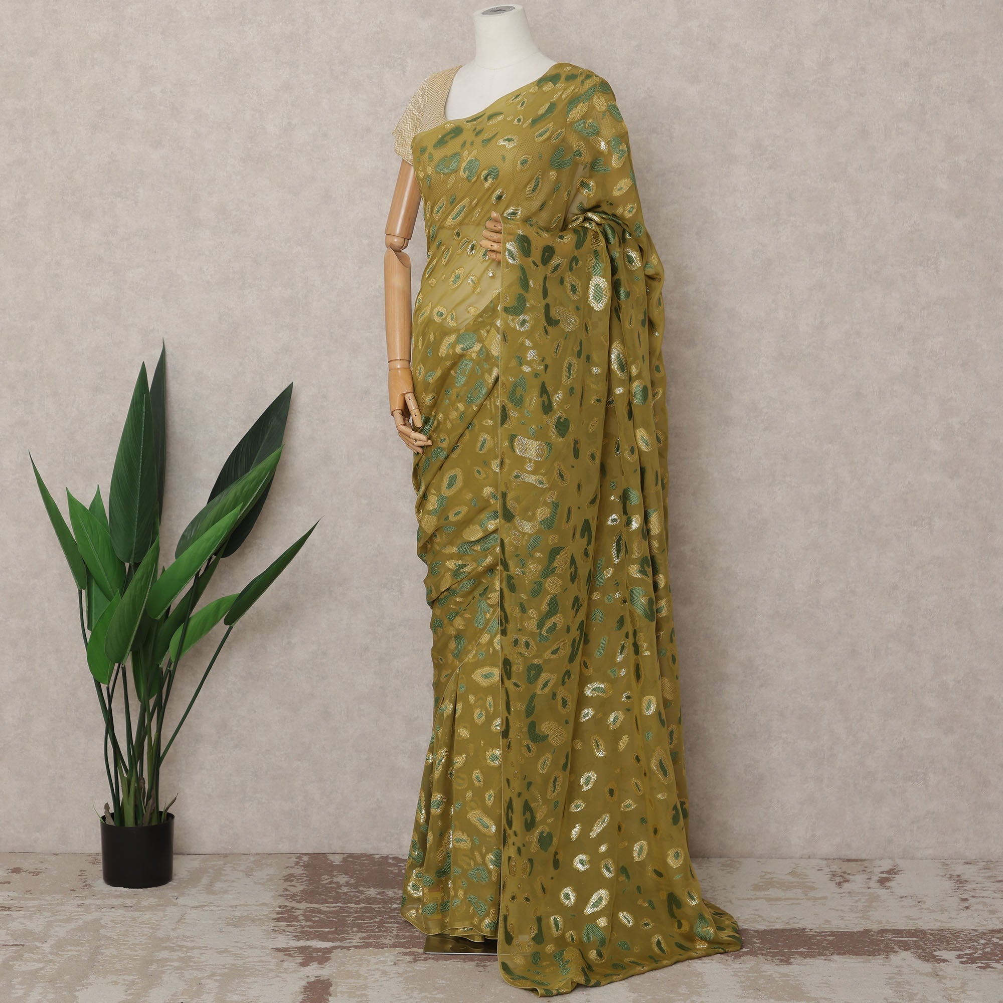 Olive Green Premium French Chiffon Saree with Metallic Lurex Abstract Work, 5.5 Mtrs Length, 110 Cms Width, Made in France-D24305