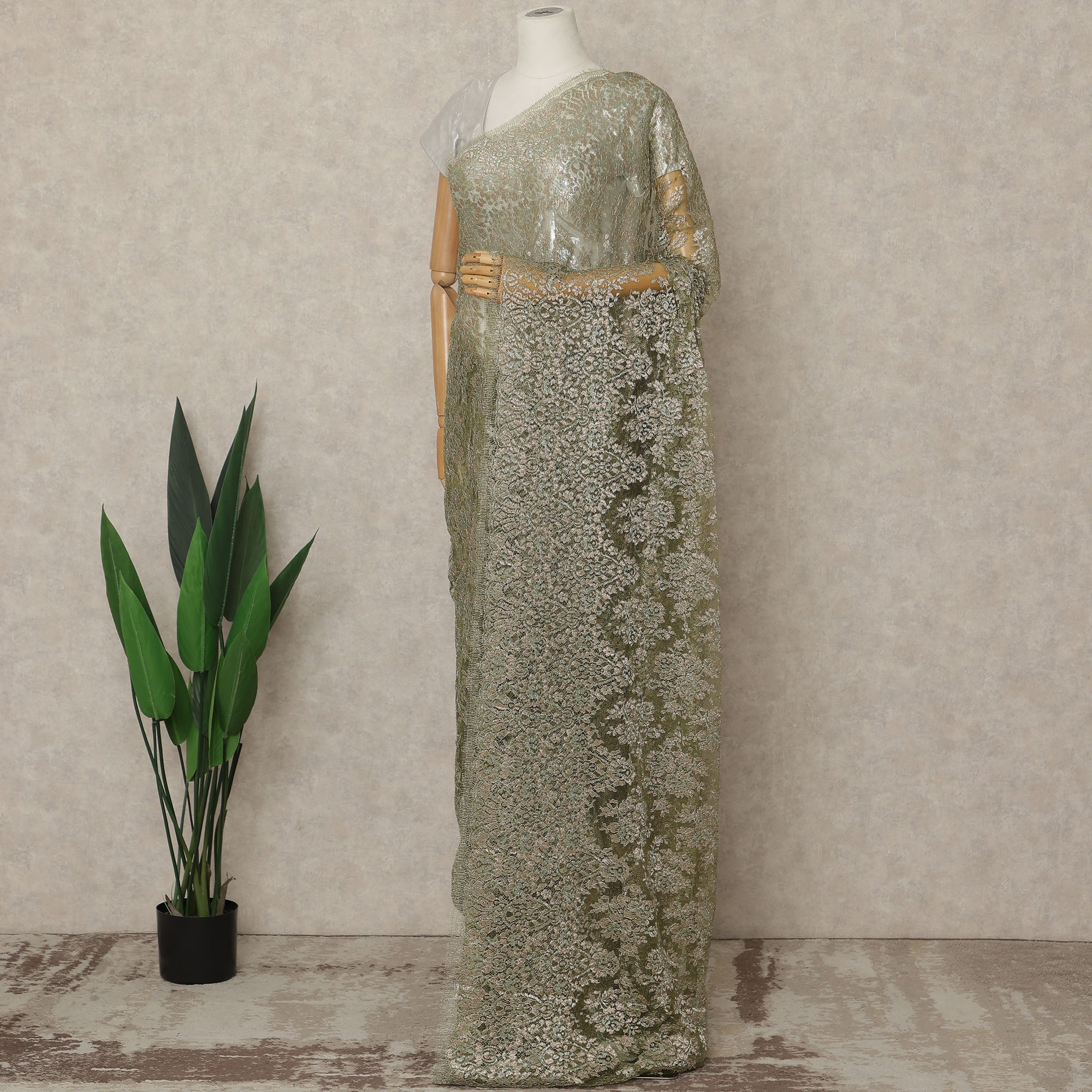 Embrace refined elegance with this Olive Green Premium French Metallic Chantilly Lace Saree, masterfully crafted in France to highlight the intricate beauty of Chantilly lace paired with a soft, luminous metallic sheen; the graceful olive-green tone accentuates the delicate floral motifs woven throughout the saree, while the metallic reflections add depth and sophistication, making it ideal for weddings, receptions, festive celebrations, and elegant evening gatherings; woven with superior Regal Fabrics craftsmanship, the saree offers a feather-light, fluid drape that ensures comfort and effortless movement, creating a beautifully flattering silhouette; measuring approximately 5.5 meters in length and 110 cms in width, it provides ample flexibility for various draping styles, and since the blouse is not included, you have complete creative freedom to style it with contrasting or complementing fabrics; perfect for discerning shoppers who love to buy exclusive designer sarees online, this French Chantilly piece is a timeless expression of luxury and artistry; to maintain its lustrous finish and intricate detail, dry clean only and store carefully to preserve its delicate lace structure and metallic brilliance.
