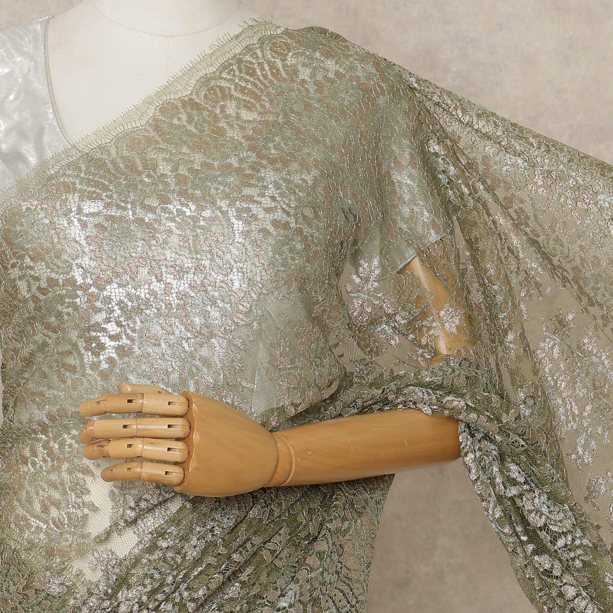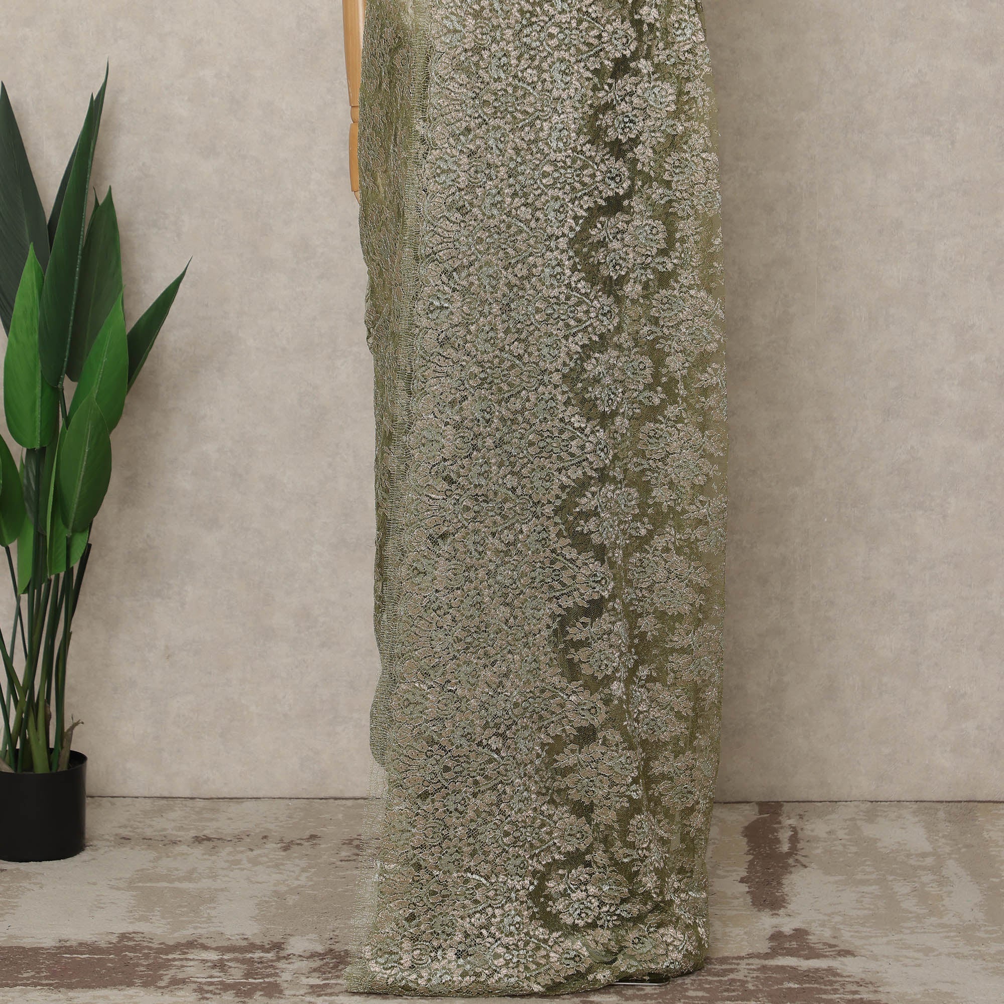 Premium French Metallic Chantilly lace in an elegant olive green shade.