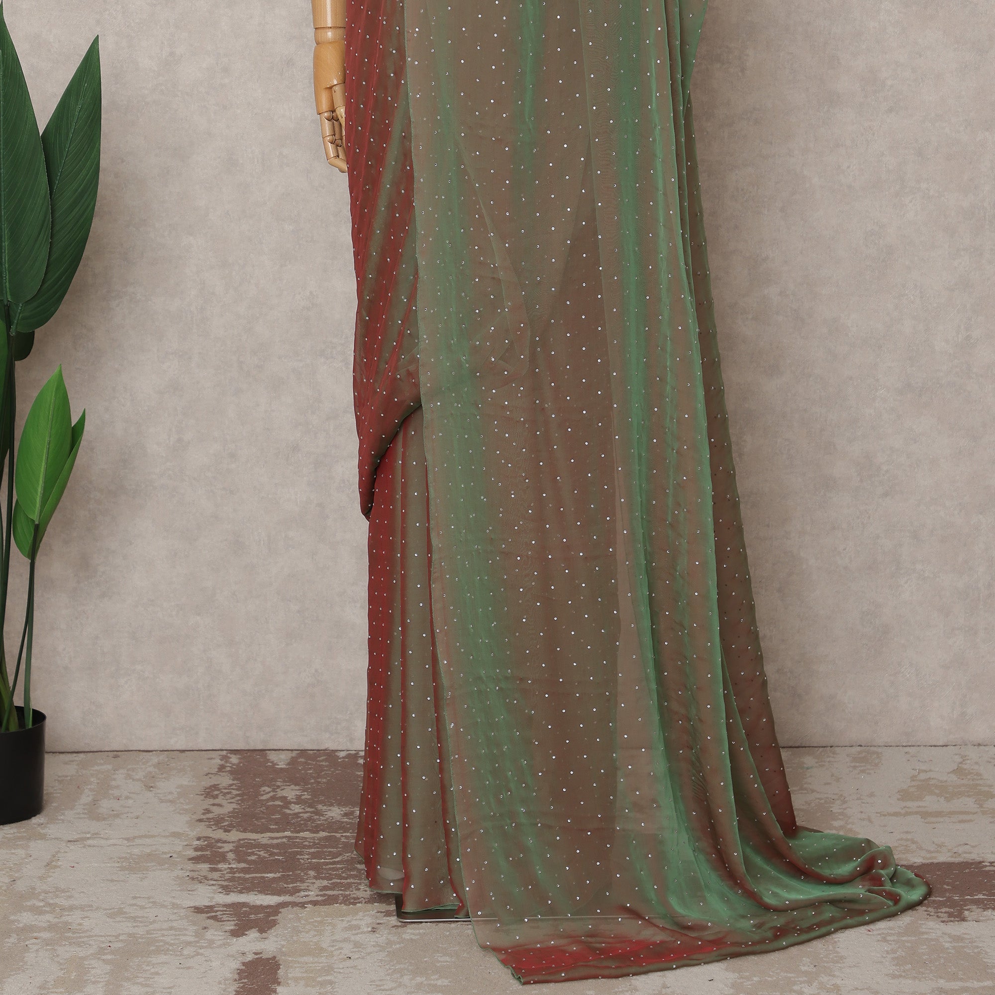 Olive Green Premium Pure Silk Chiffon Saree with Stone Work, 5.5 Mtrs with 110 Cms Width, Imported from South Korea-D25438