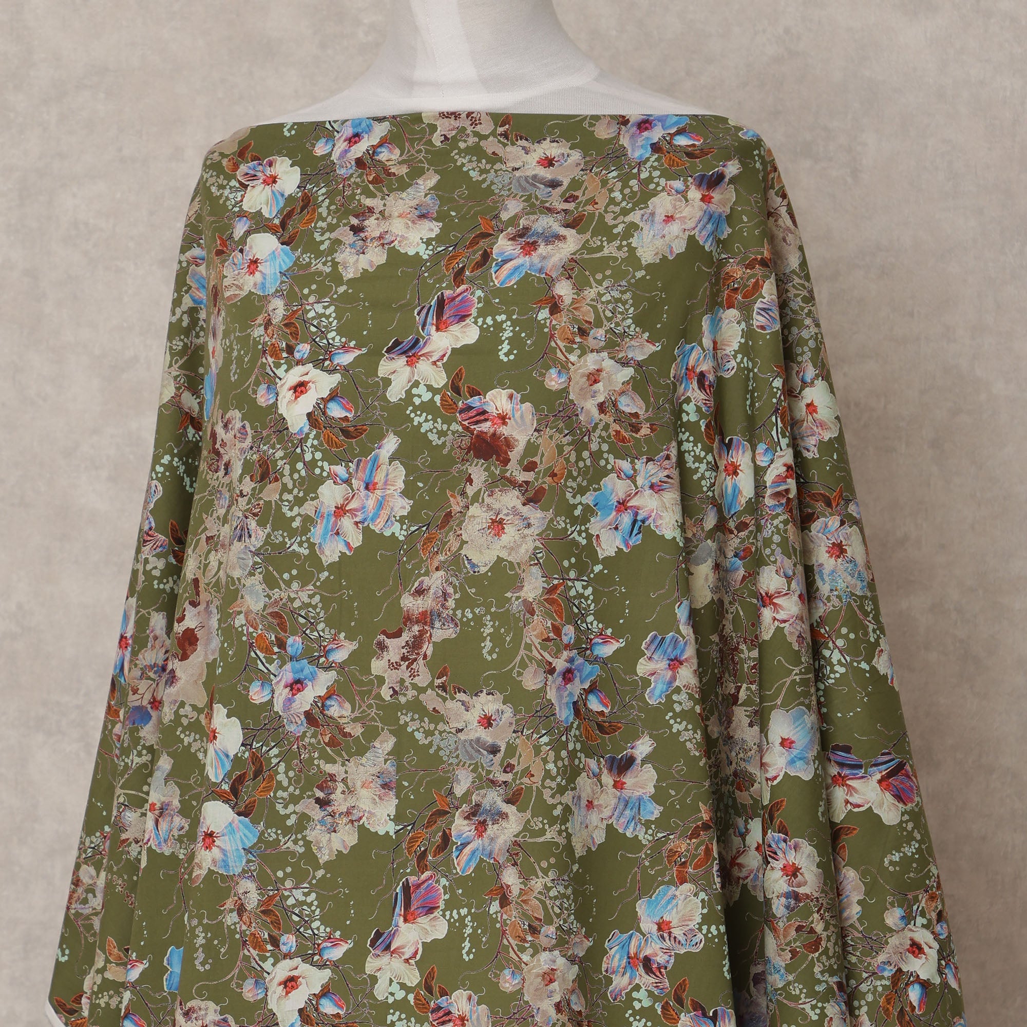 Olive Green Somali Cotton Voile Printed Dirac Fabric with Multicolor Floral Design, 3.5 Mtrs, Width 140 Cms, Made in India-D24061