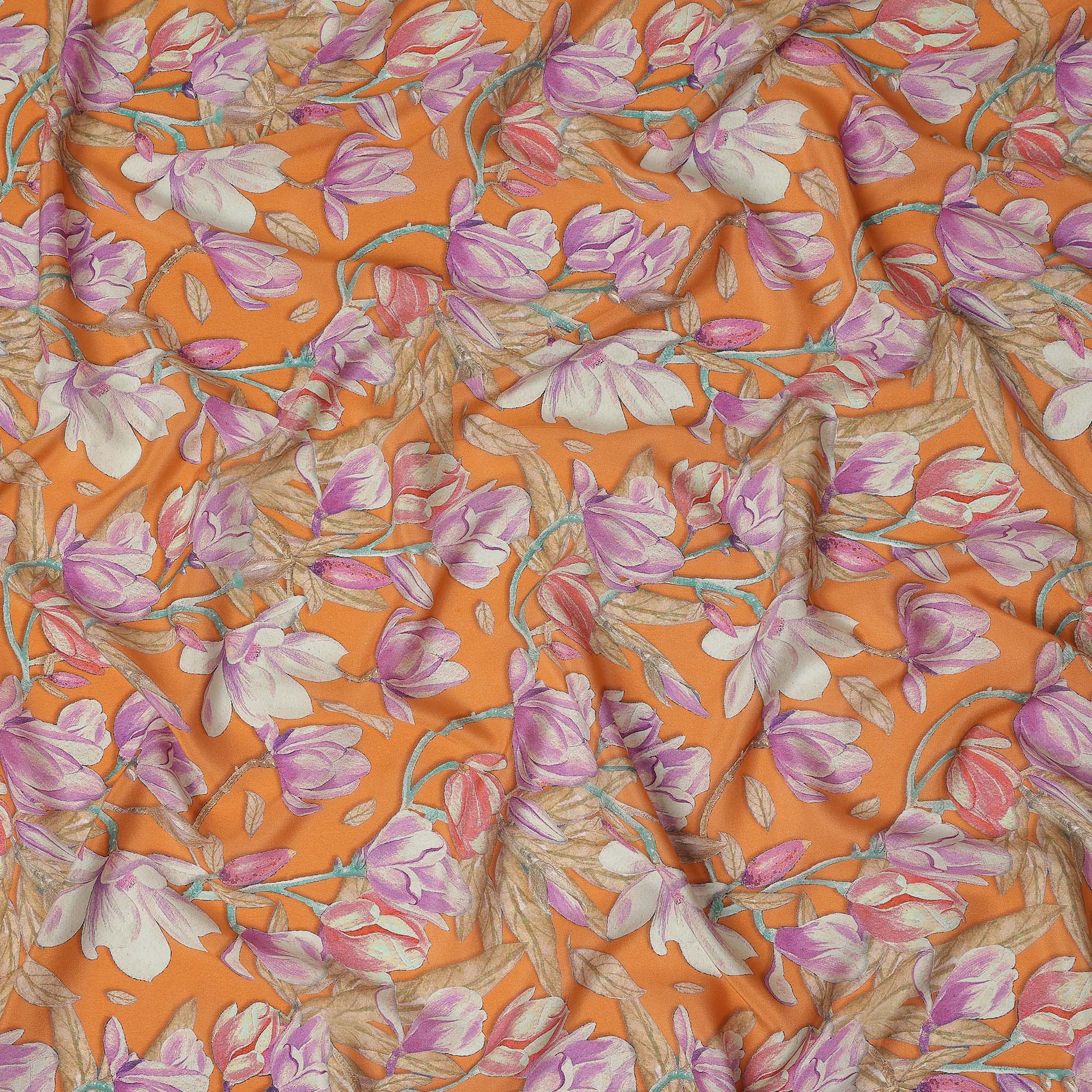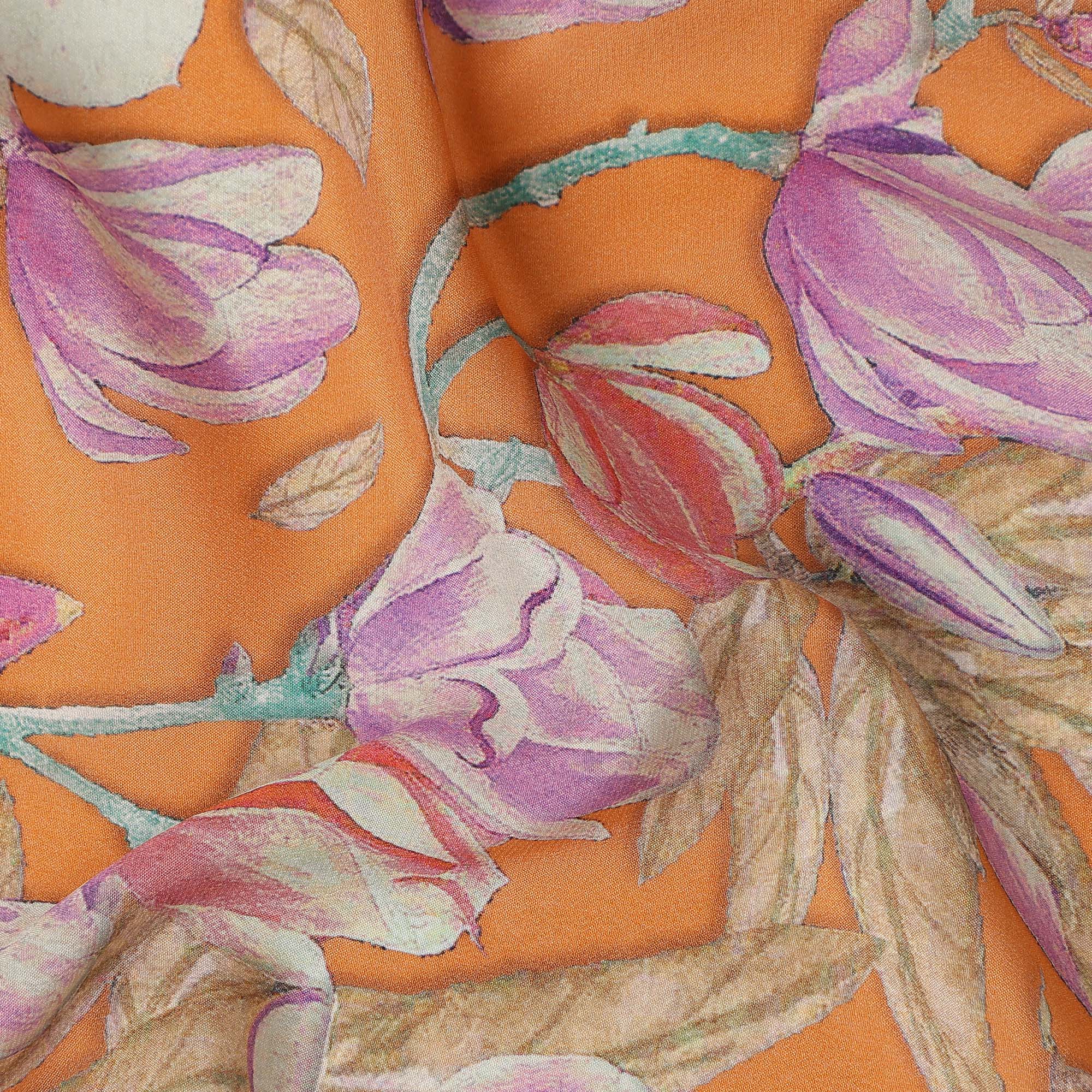 Orange Floral Printed Premium Pure Silk Crepe Fabric Large Blossom Vine Design Soft Lightweight Dress Material 110 Cms Width India-D28011