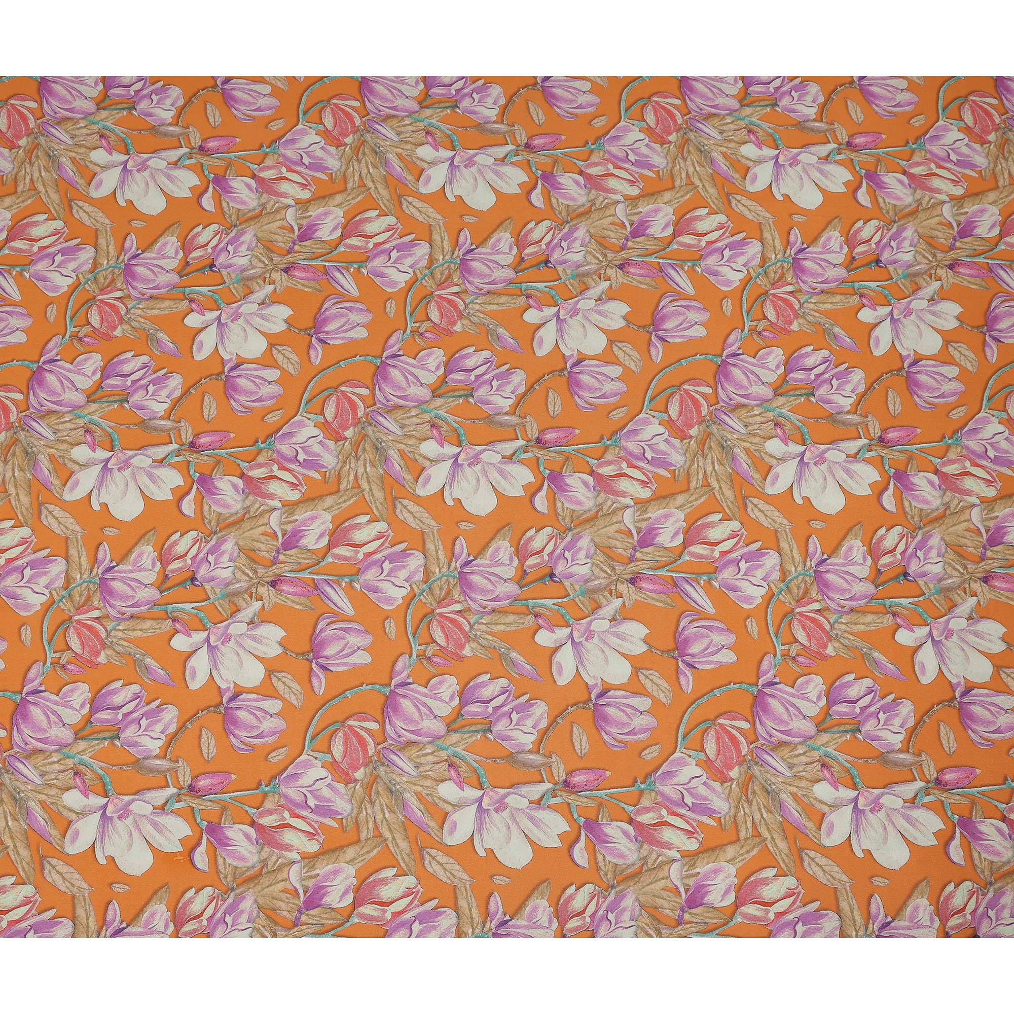 Vibrant orange base enhanced with large floral blossom vine print for bold refined appeal