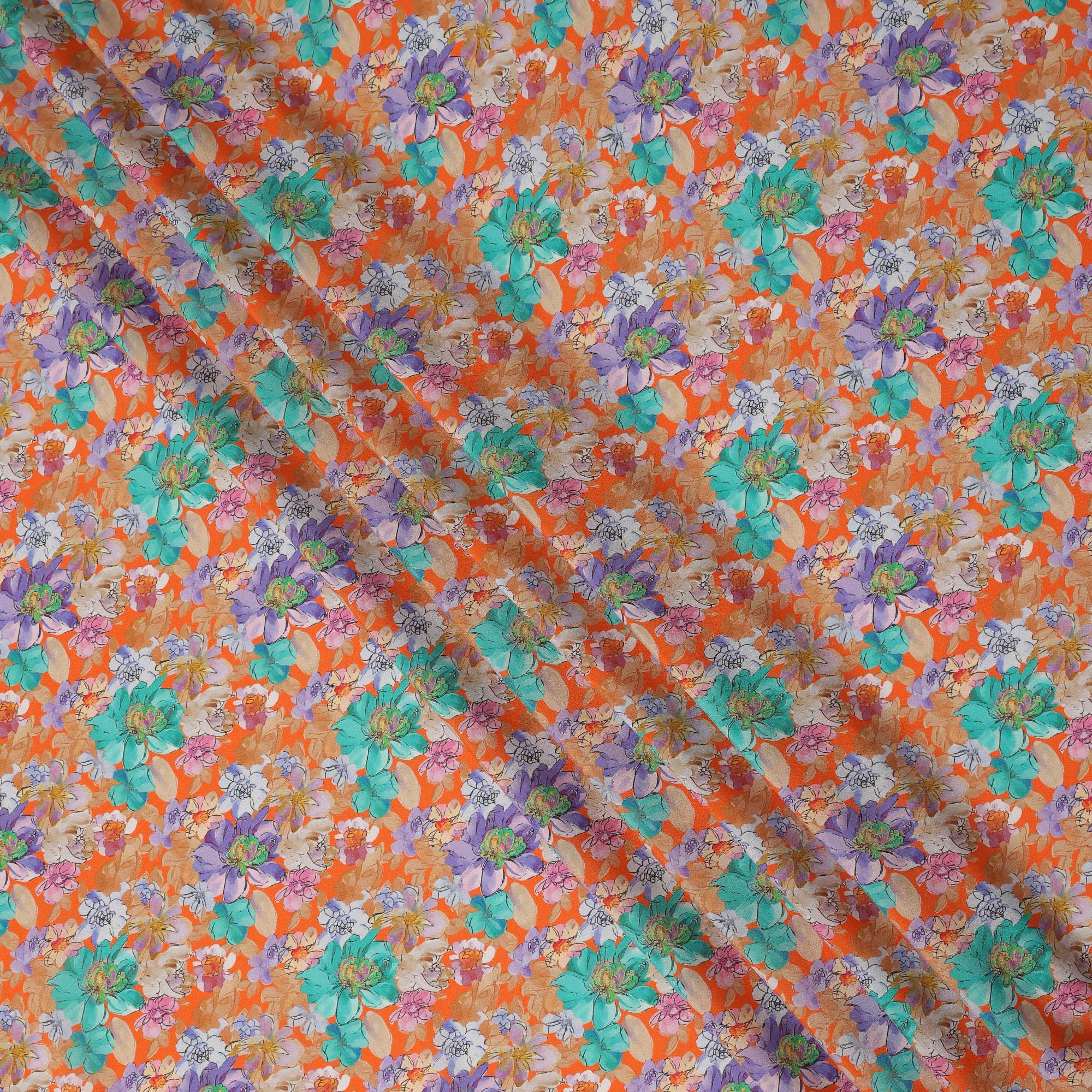 Orange Multicolor Floral Printed Premium Pure Silk Crepe Fabric Large Blossom Garden Design Soft Lightweight Dress Material 110 Cms Width India-D28007