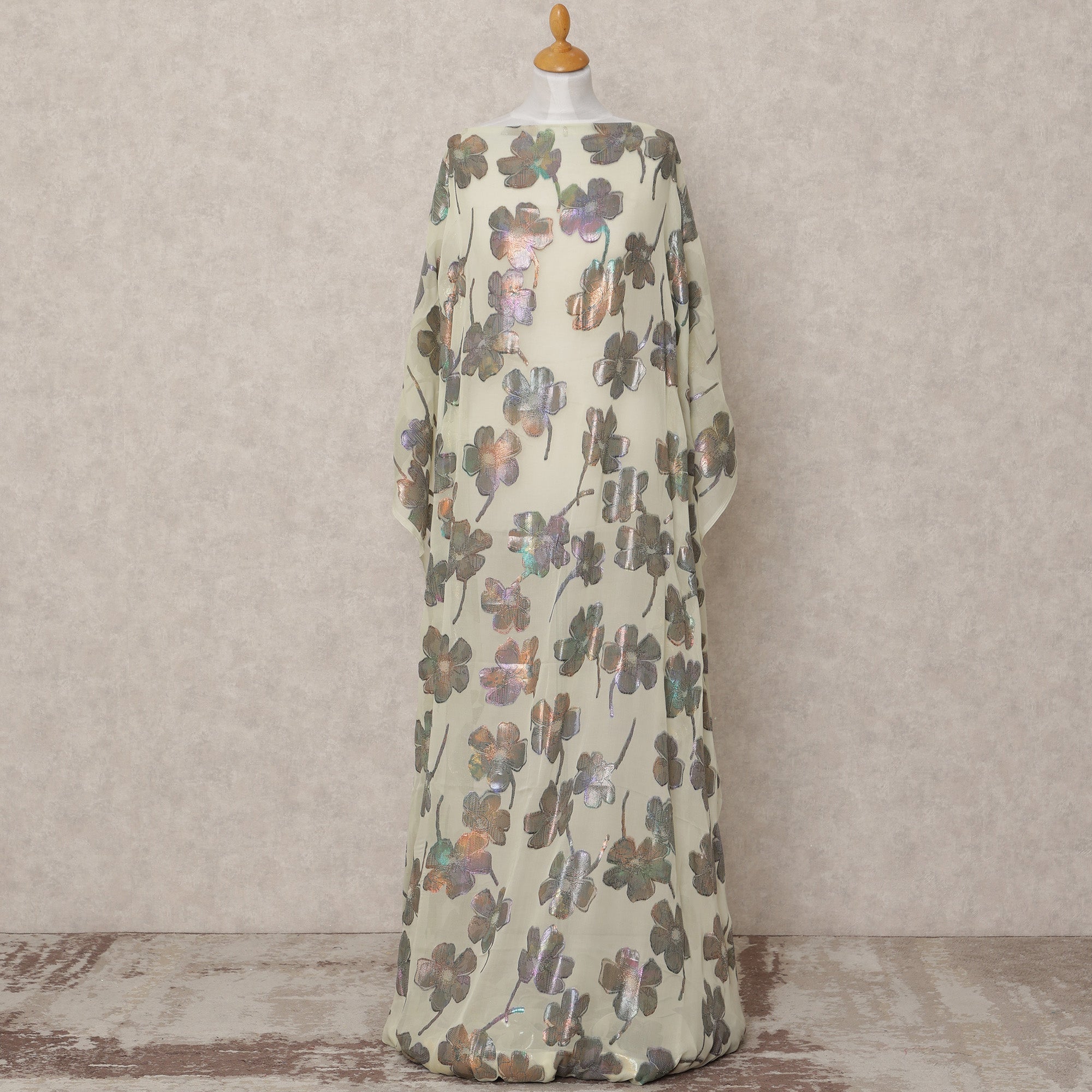 This pale Yellow pure silk chiffon Somali dirac fabric with metallic floral lurex features an elegant blend of subtle color and reflective floral detailing, ideal for luxurious traditional and occasion wear. The sheer silk chiffon base flows effortlessly and is adorned with shimmering multi-color floral motifs that catch the light from every angle. Made in South Korea, this high-quality fabric measures 3.5 meters in length and 140 cm in width, offering generous coverage and versatility for flowing garments such as diracs and overlays. Its sophisticated sheen, soft texture, and bold floral design make it perfect for weddings, festive events, or any elegant cultural celebration.