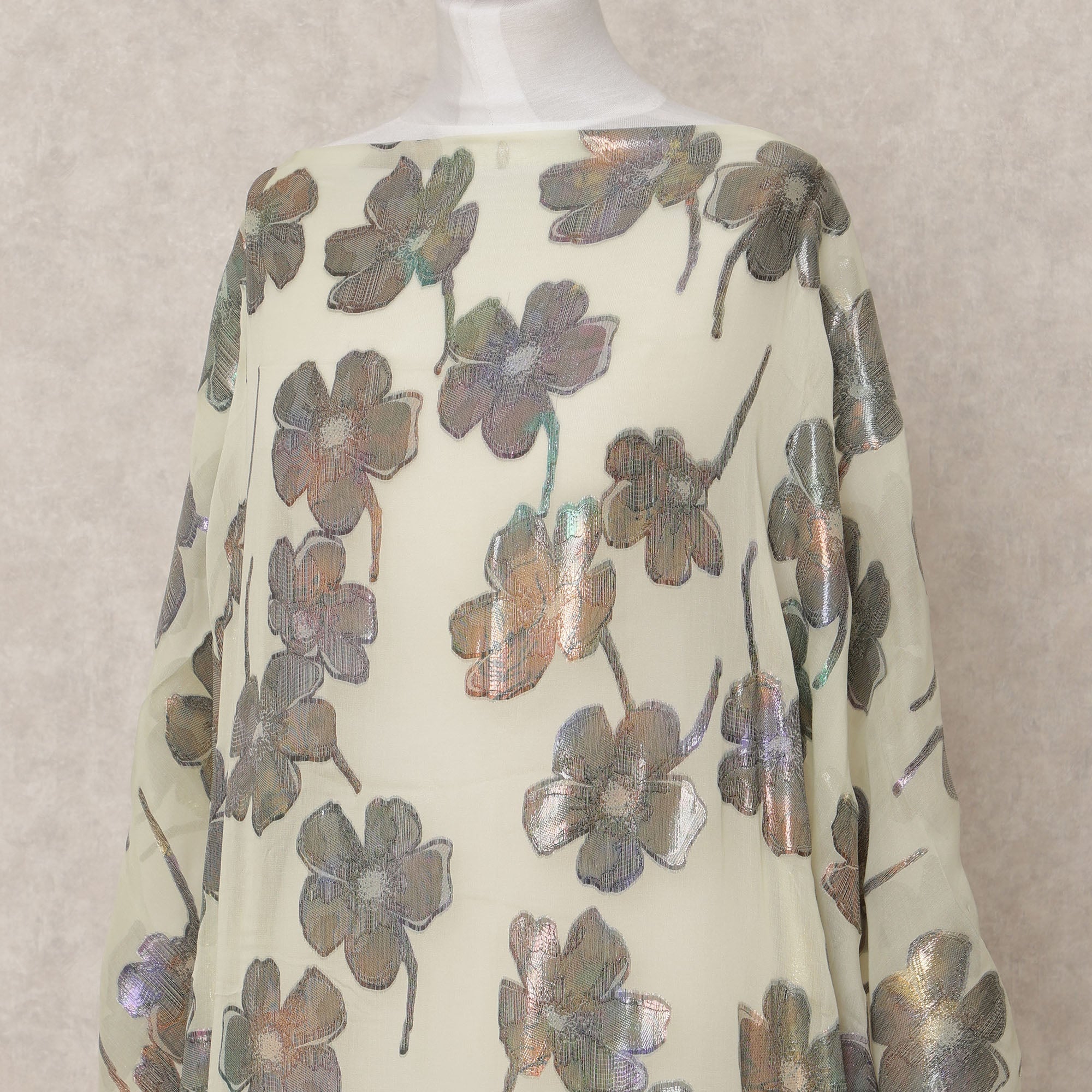 Pale Yellow silk chiffon base with shimmering multicolor metallic floral lurex