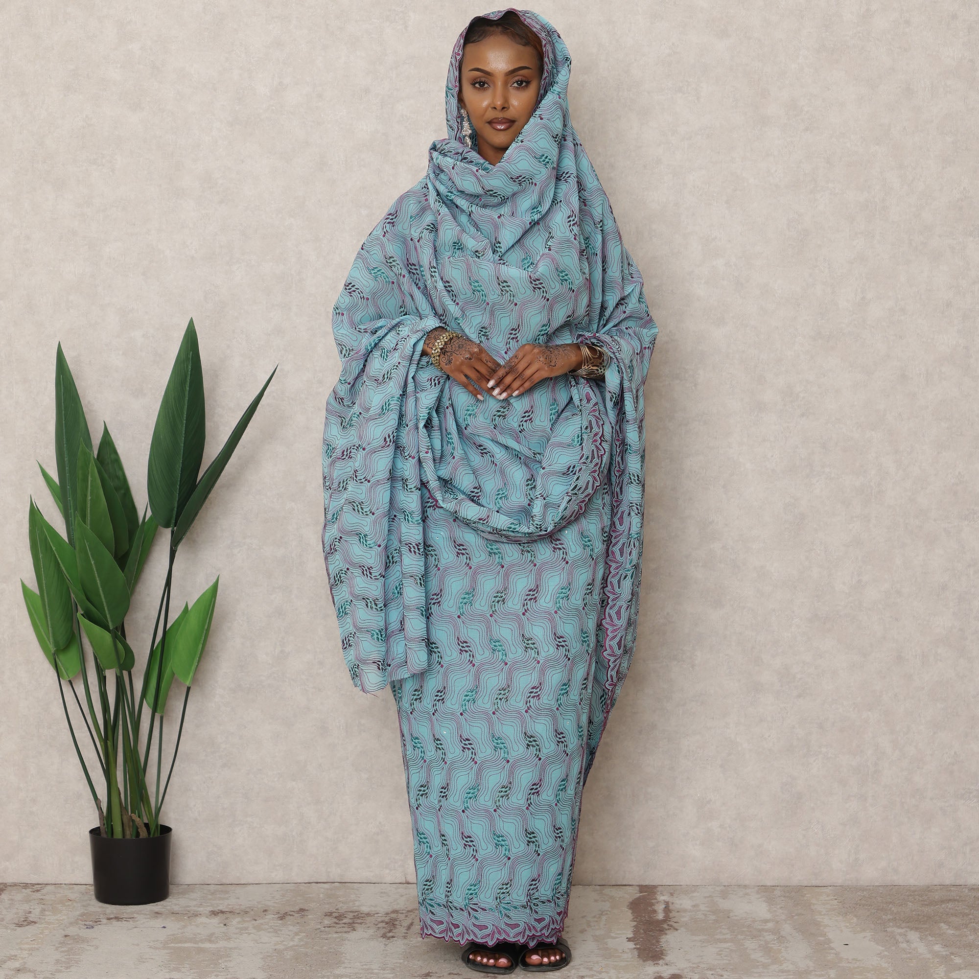 This pastel aqua Swiss thobe is a graceful embodiment of subtle charm and cultural richness, tailored from 100% pure cotton voile to ensure unmatched softness and lightweight elegance. The 4.5-meter-long fabric is beautifully adorned with fine embroidery in violet and black, accompanied by delicate stone embellishments that bring out the movement and texture of the flowing design. The soft sheen of the voile enhances its visual appeal, while the gentle pastel base adds a refreshing calmness to the overall attire. With a width of 140 cms, this traditional Sudanese ensemble provides ample fabric to drape comfortably and fashionably. Made in Switzerland, this piece captures the timeless essence of heritage with the finesse of modern craftsmanship. Shop online and embrace tradition in comfort and style.