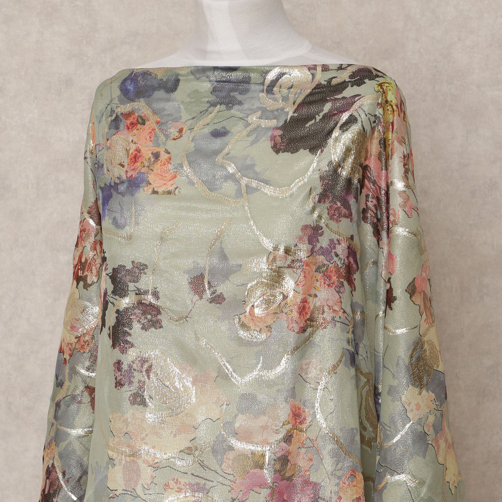 Pastel Green Floral Metallic Somali Silk Chiffon Dirac Fabric – 3.5 Meters, Width 140 cm, Made in South Korea-D24731