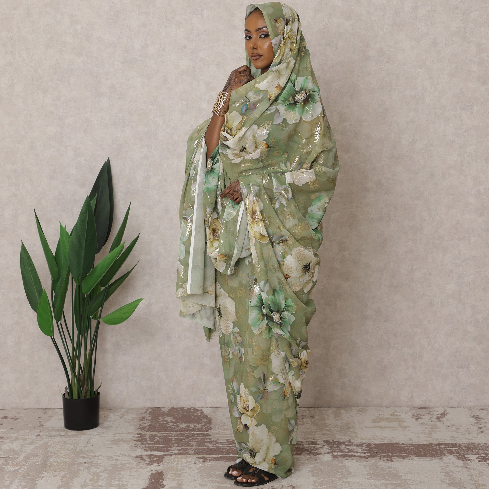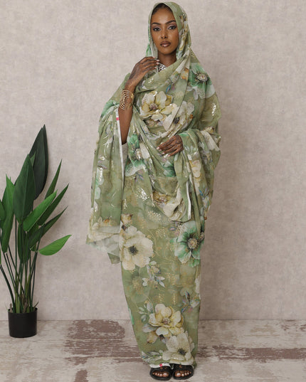 Embrace timeless elegance with this exquisite Pastel green traditional Sudanese thobe, crafted from premium pure cotton voile fabric for a soft, breathable, and lightweight feel. The 4.5-meter-long fabric drapes beautifully, creating a sophisticated and modest silhouette perfect for cultural gatherings, festive occasions, and everyday wear. Featuring a stunning floral print in shades of white, gold, and green with delicate shimmer accents, this thobe seamlessly blends tradition with contemporary grace. With a width of 140 cm, it provides full coverage while maintaining an airy and comfortable fit. Expertly crafted in India, this high-quality thobe is easy to maintain, ensuring long-lasting fabric softness and color vibrancy even after multiple washes, making it a must-have addition to your wardrobe.