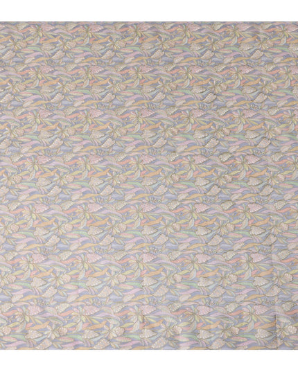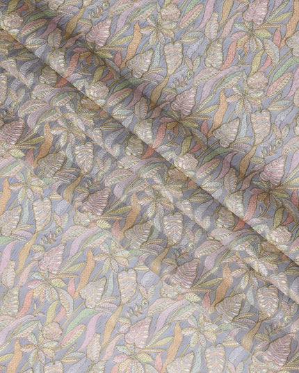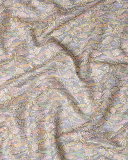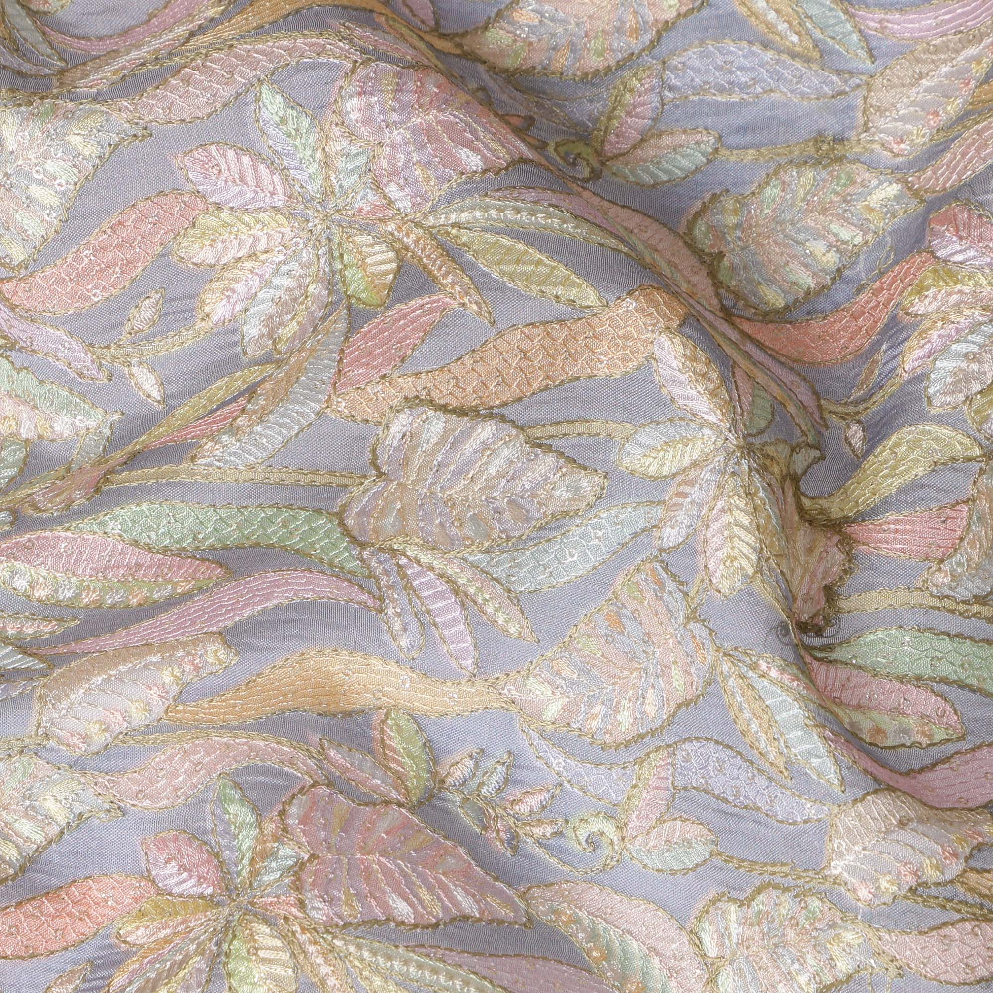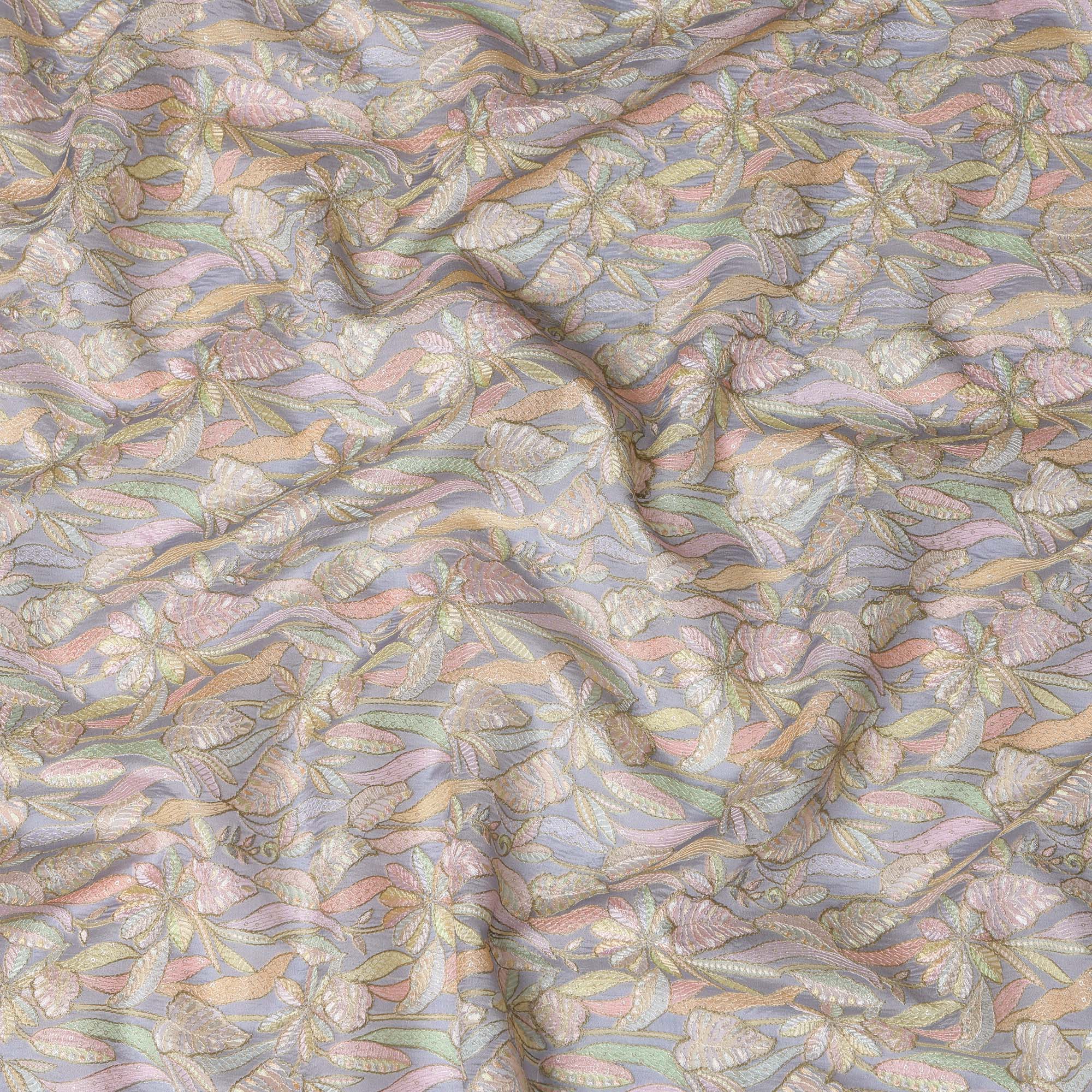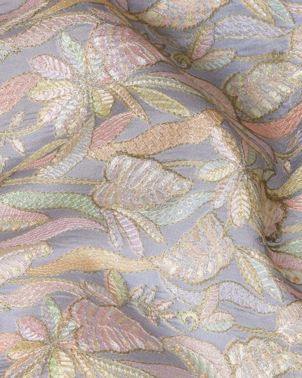 Pastel Grey Indian Tussar Silk Fabric with Embroidery, Floral Design, 110 cm Width-D20941