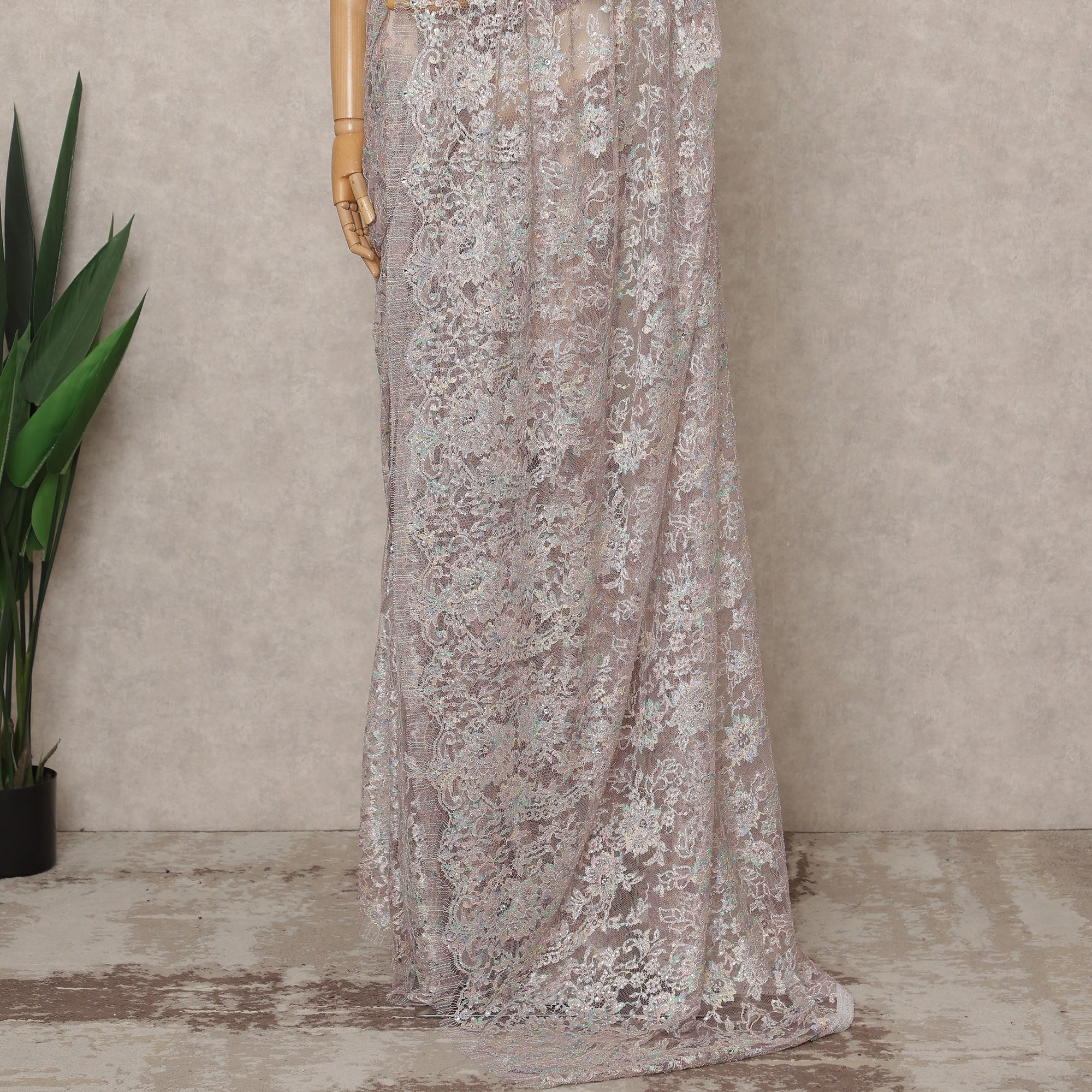Pastel Lilac Pink Premium French Metallic Chantilly Lace Saree with Stone Work, Width 110 Cms, 5.5 Mtrs, France-D25574