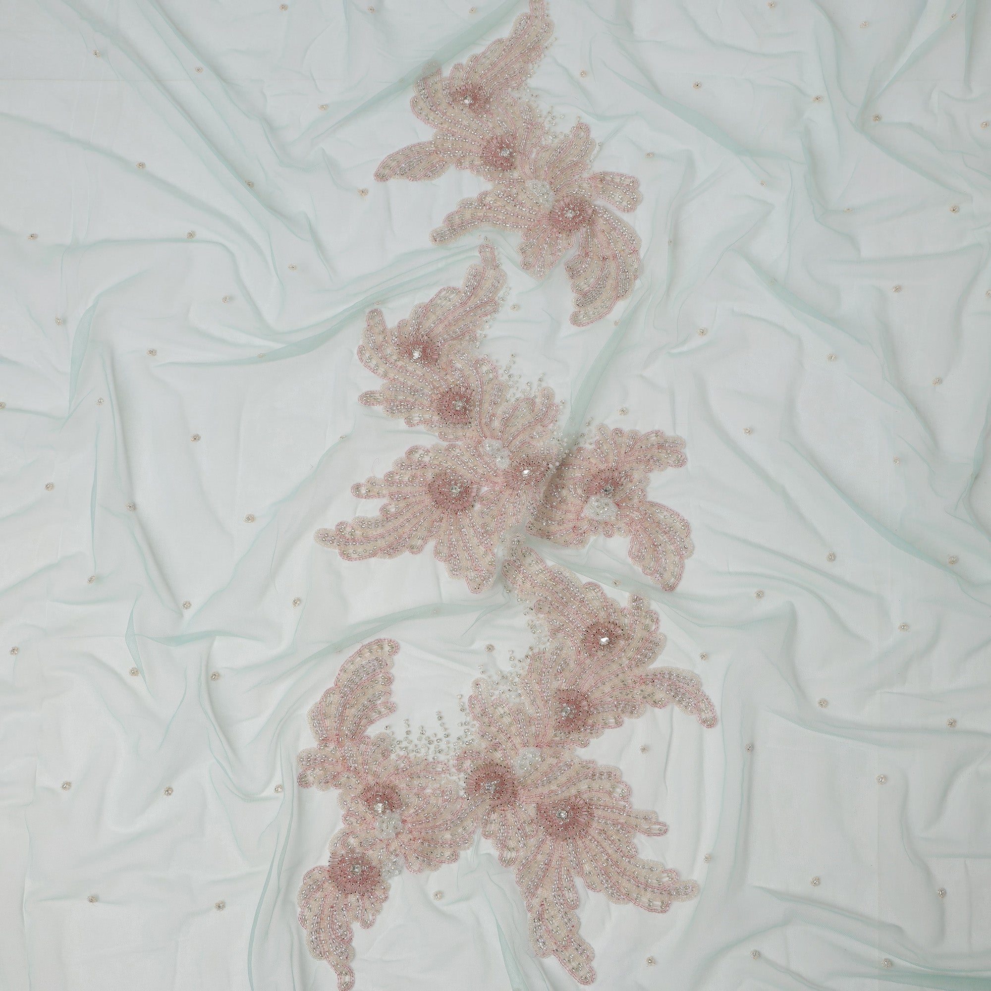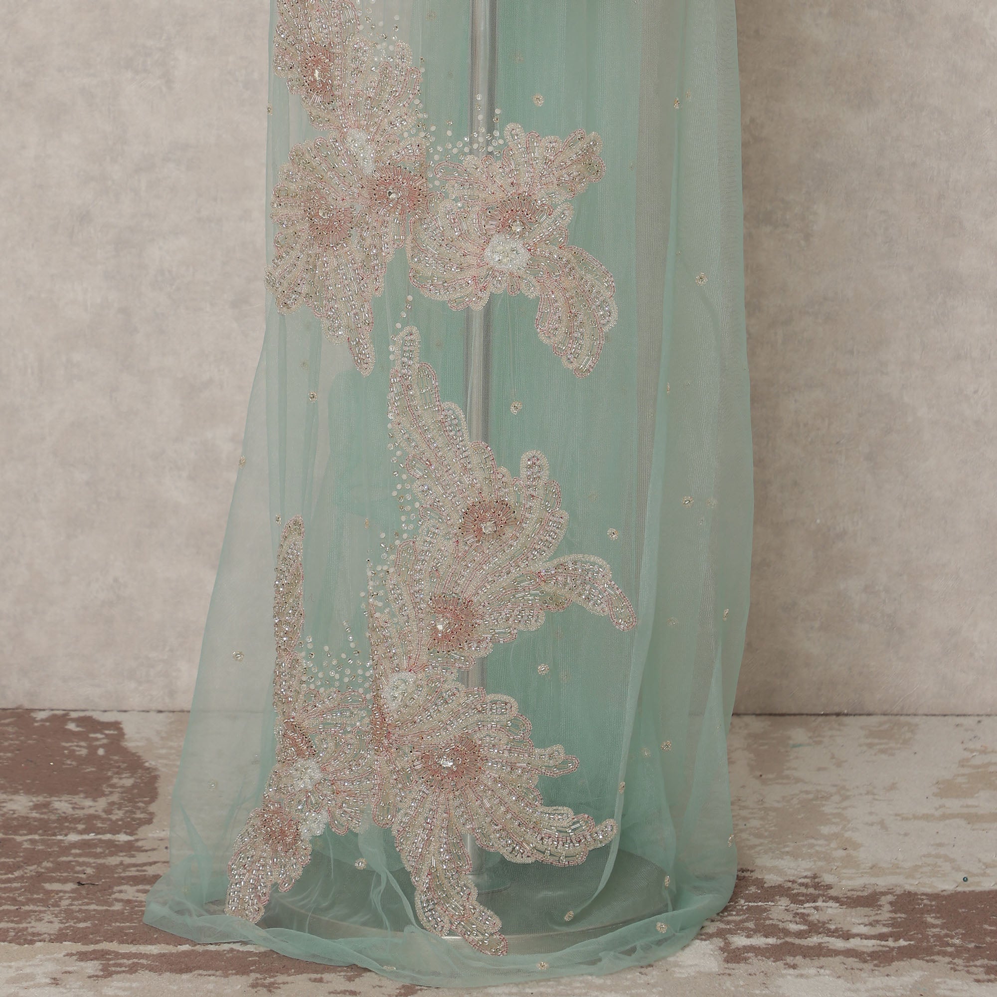This pastel mint nylon tulle fabric captures subtle sophistication through intricate floral embroidery crafted with blush-toned beads, sequins, and delicate hand embellishments. Designed specifically as a 3-meter piece for Fustaann dresses, this fabric features flowing floral motifs that cascade beautifully across the sheer mint base. The light pastel hue pairs effortlessly with shimmering embellishments, making it ideal for bridal, festive, or luxury occasion wear. Measuring 140 cm in width, this fabric provides ample coverage for creative silhouettes, combining breathability with a graceful drape. Each embroidered element showcases expert Indian craftsmanship and a timeless design sensibility. This is the perfect choice for designers looking to buy online a high-end, artisan-crafted fabric to elevate custom fashion pieces.