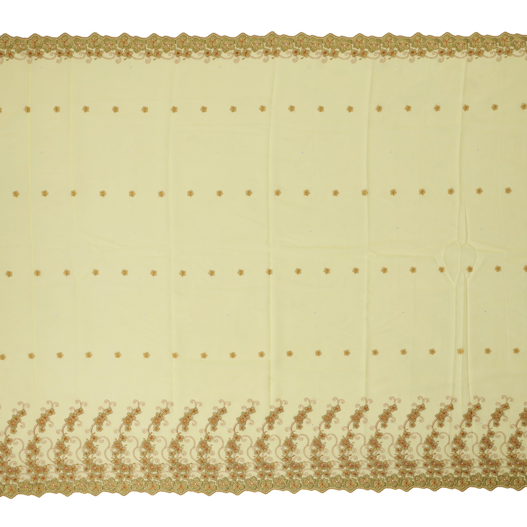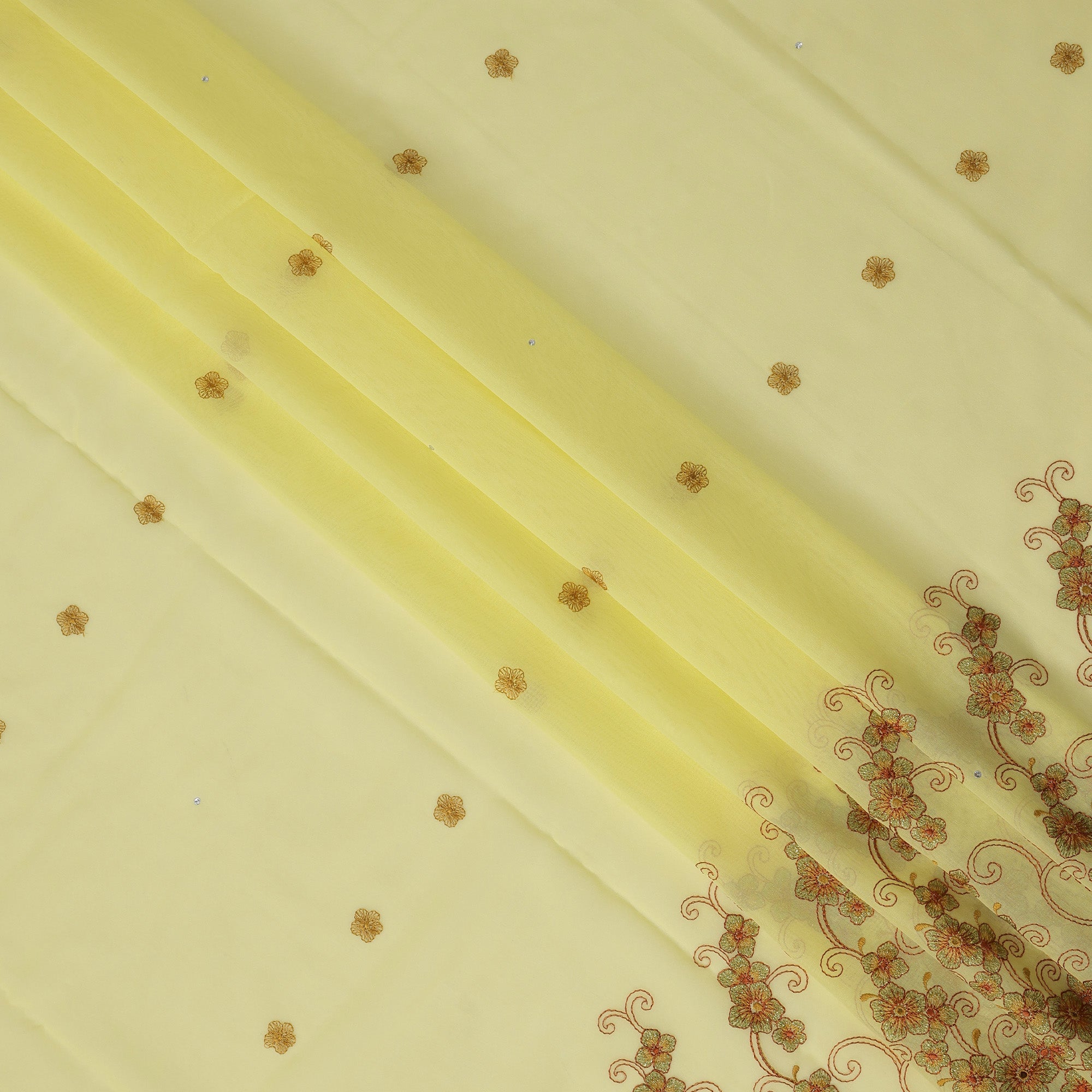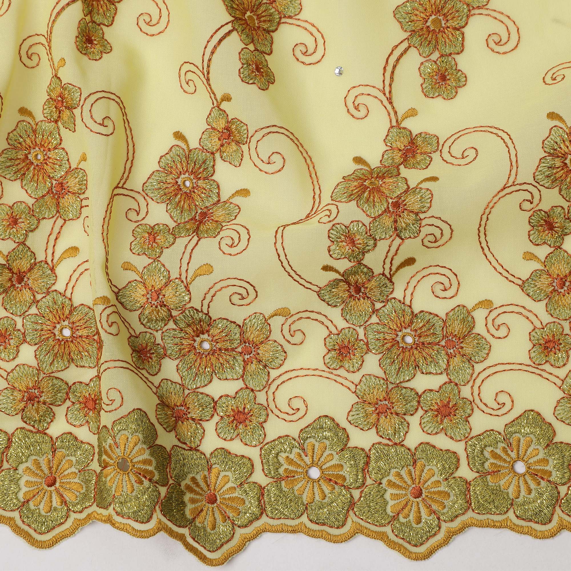 Pastel yellow cotton voile fabric with golden floral embroidery and subtle stone accents.