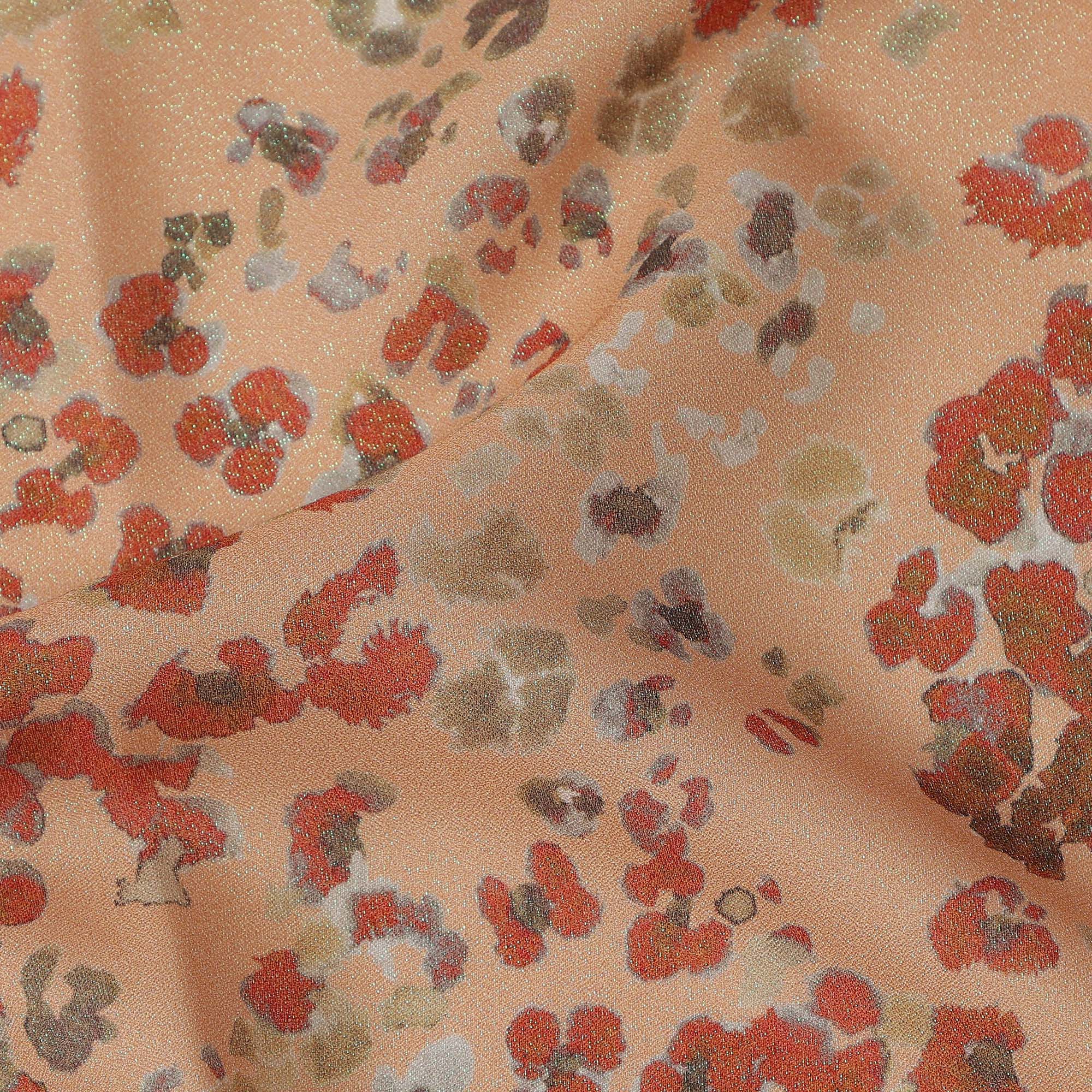 This peach base multicolor abstract floral printed pure silk satin fabric is a stunning blend of sophistication and modern artistry, designed for those who appreciate timeless elegance with a fresh twist. The soft peach backdrop exudes warmth, while the scattered floral-inspired abstract motifs in red, brown, white, and hints of purple add depth and vibrancy, making it ideal for both traditional and contemporary ensembles. Crafted from 100% pure silk, the fabric offers a natural sheen, buttery smooth surface, and a graceful drape that enhances the fall of any garment. With a width of 140 cms, it is versatile for creating sarees, lehengas, gowns, skirts, designer blouses, and chic dresses. Its lightweight yet luxurious nature makes it breathable and comfortable for all-day wear. Made in South Korea, this fabric reflects fine craftsmanship and premium quality, making it a perfect choice for bridal wear, festive occasions, and high-fashion creations.