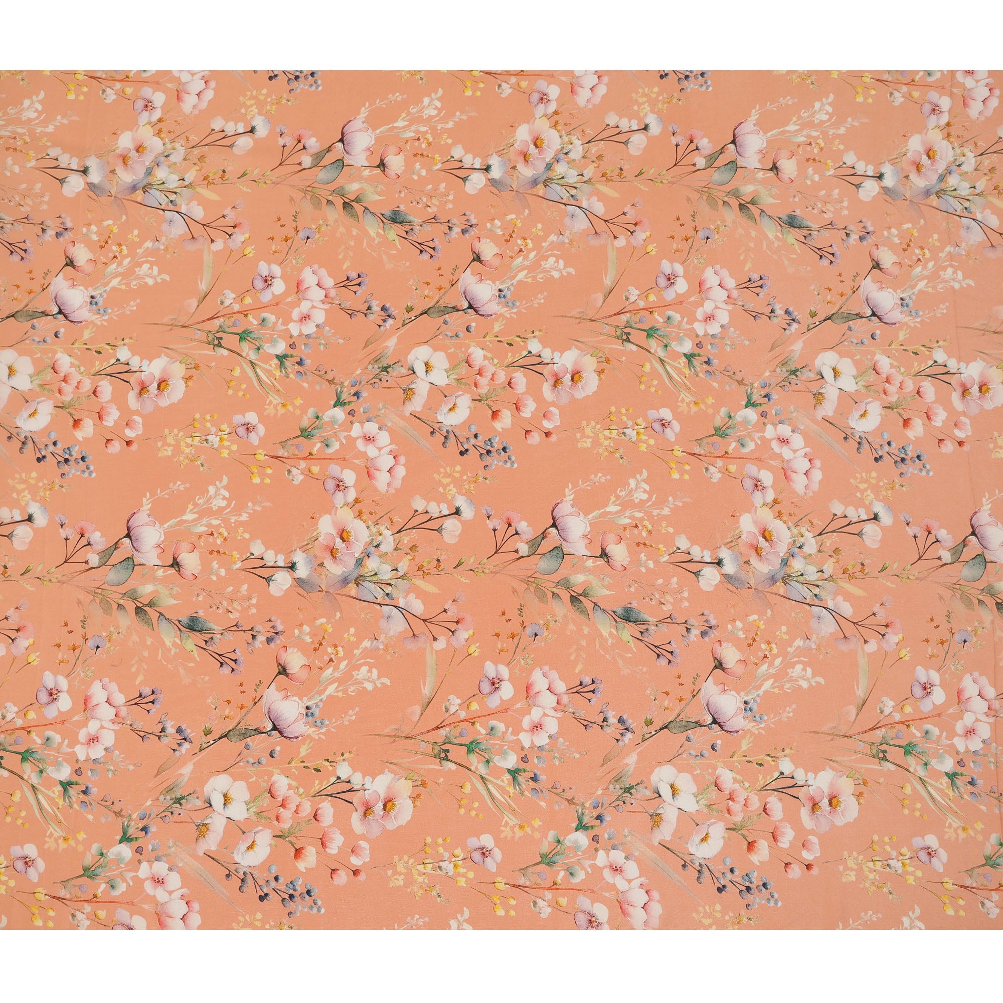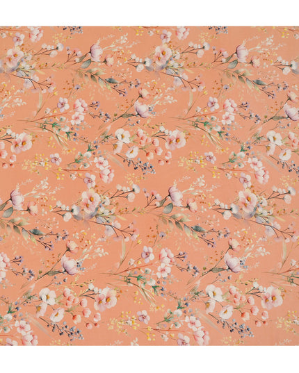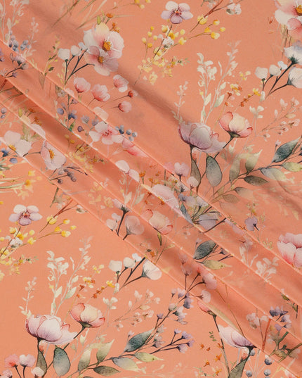 Peach Base Pastel Floral Print Silk Crepe Fabric with Soft Watercolor Blossoms, Smooth Drape, 110 cms Width, Made in India-D23353