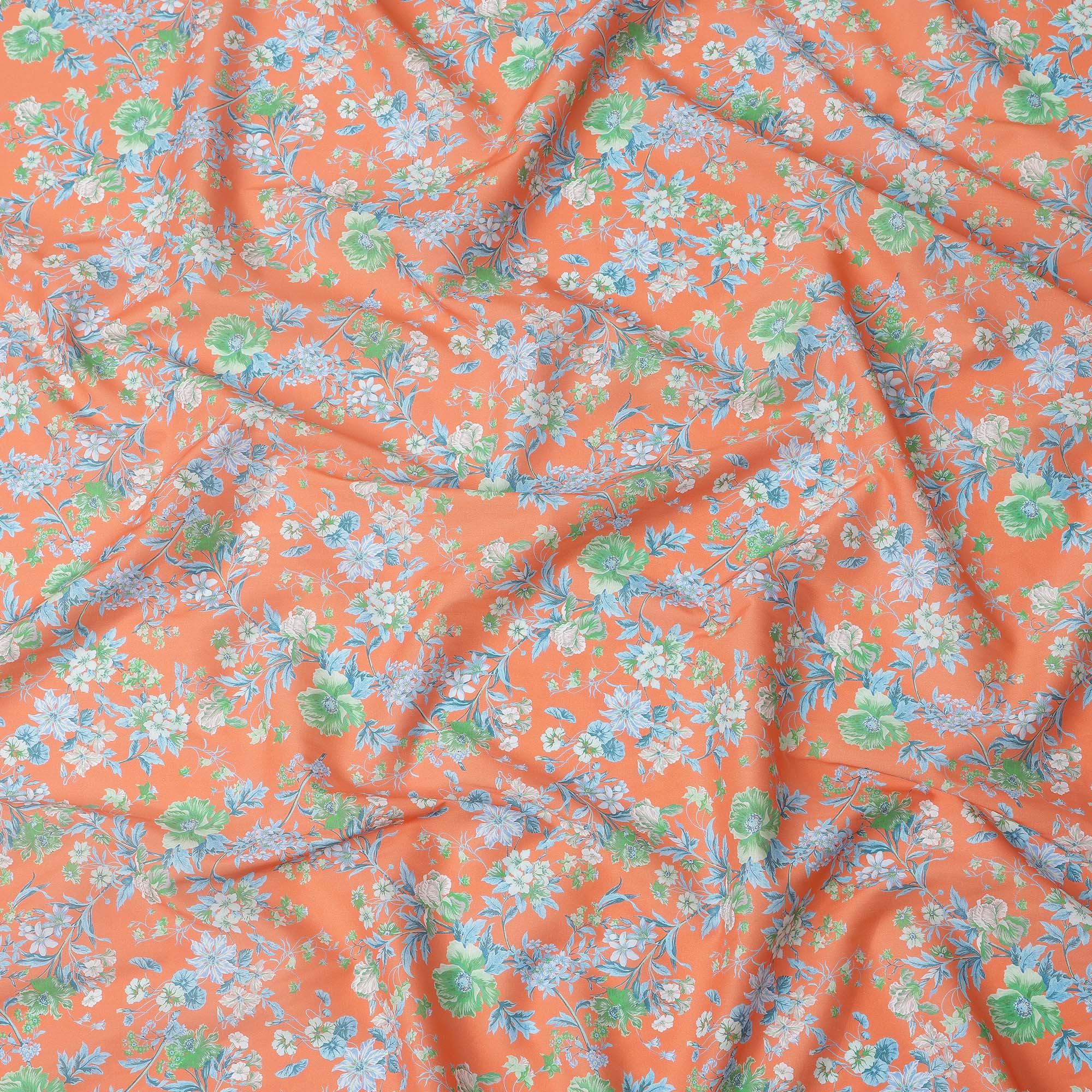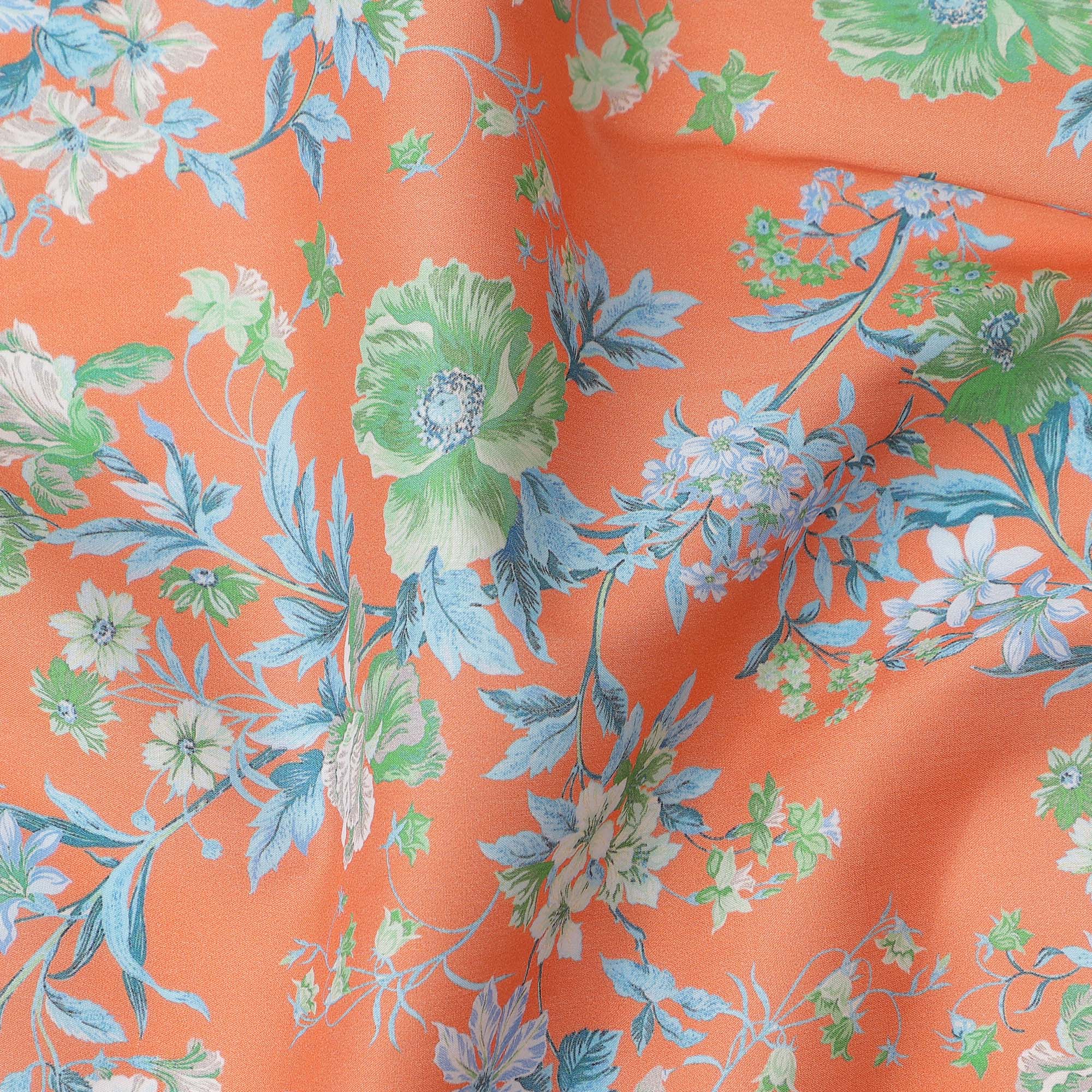 Peach Base with Green and Blue Floral Print Pure Cotton Lawn Fabric, 140 Cms Width, Made in India-D26014
